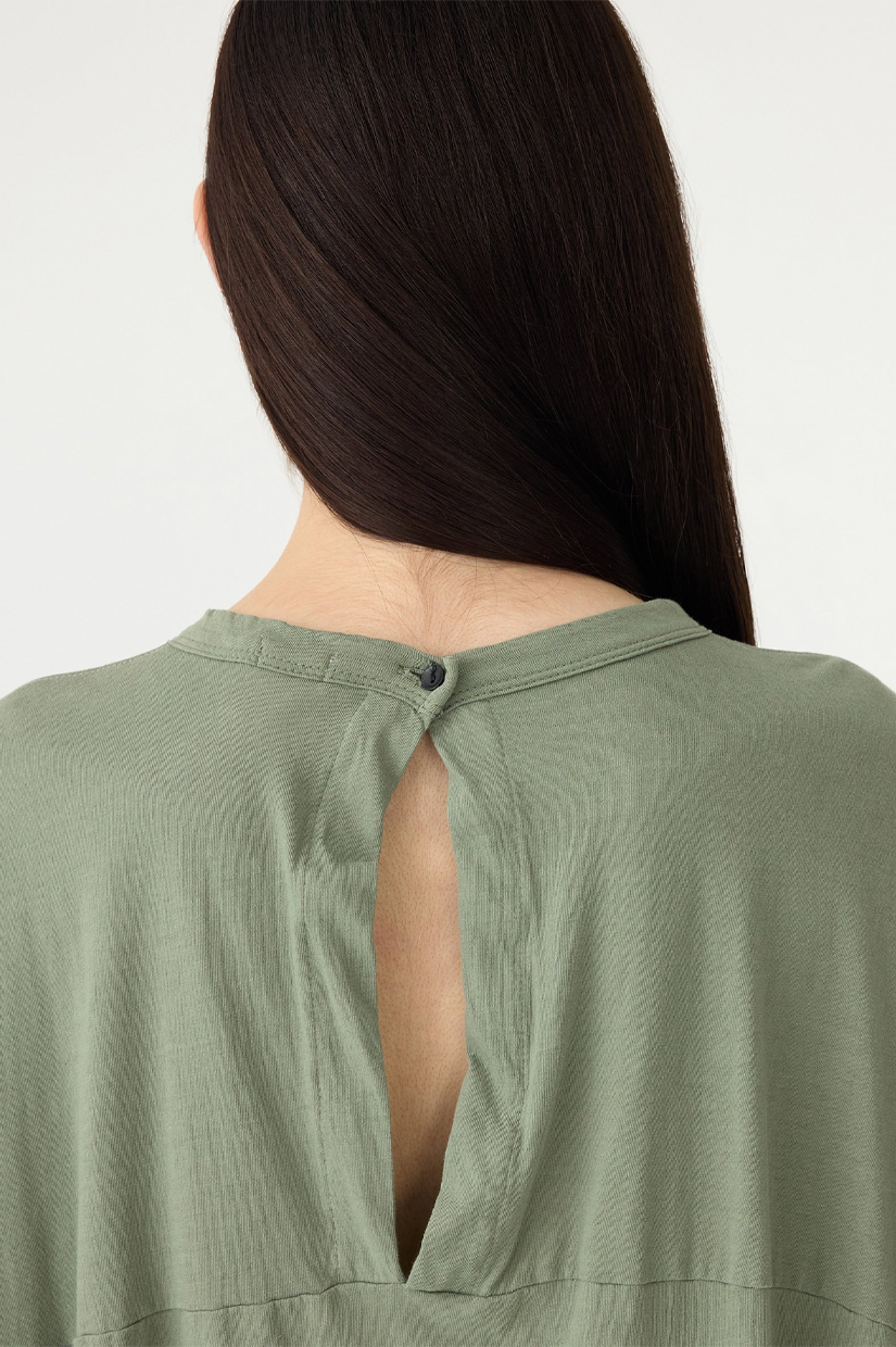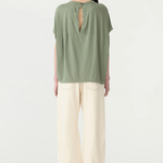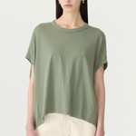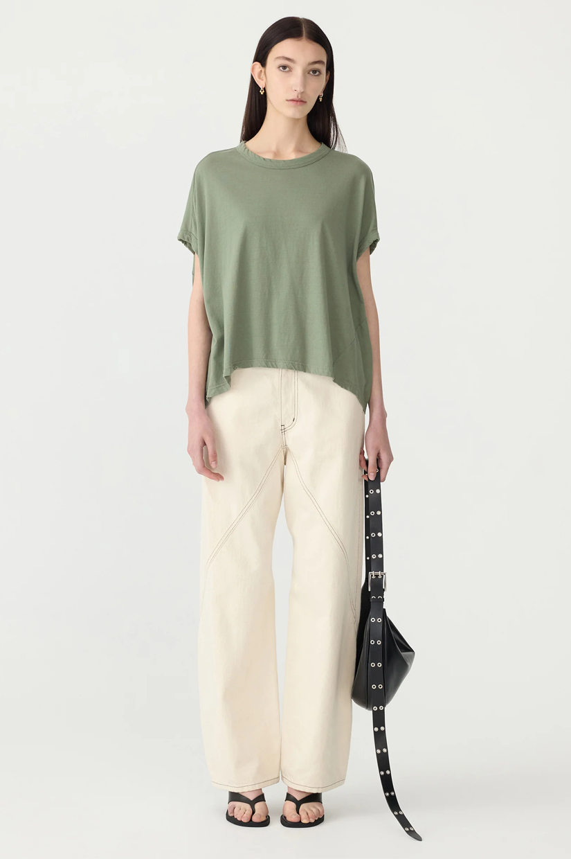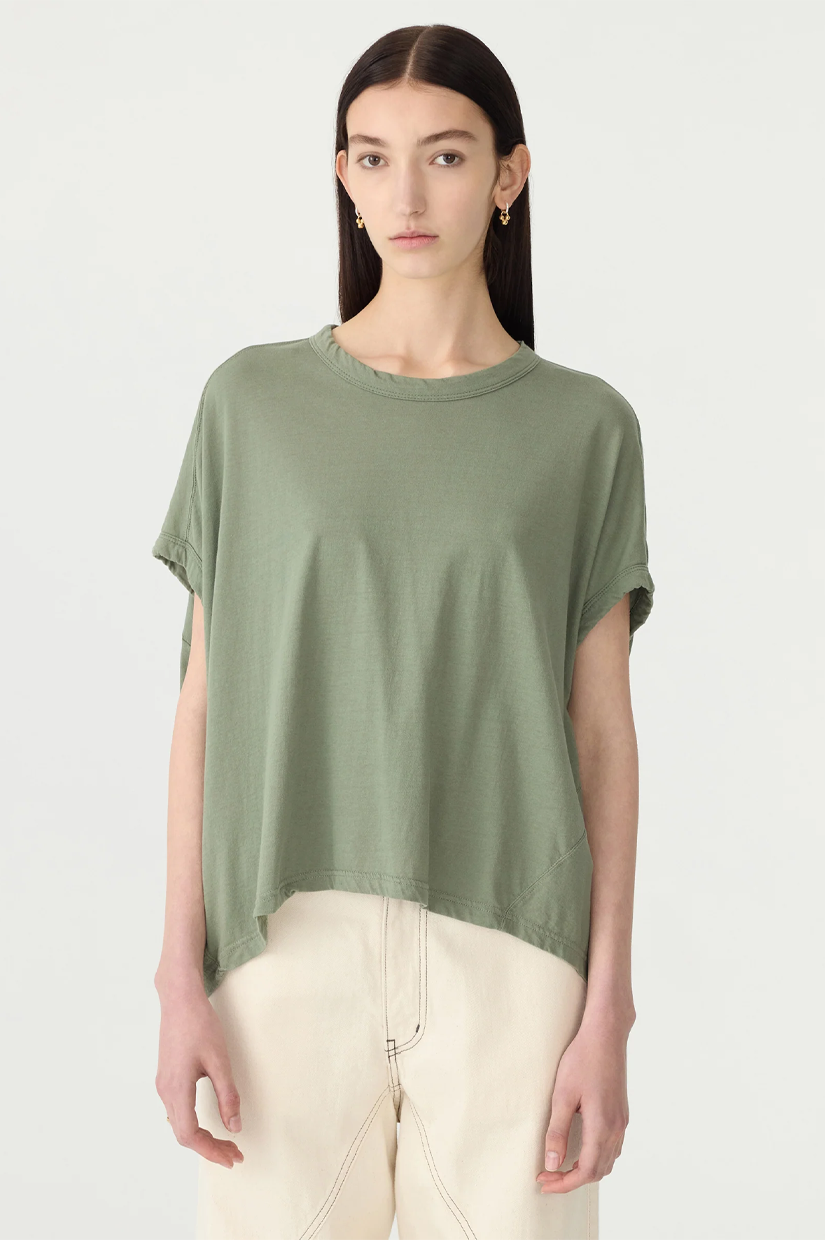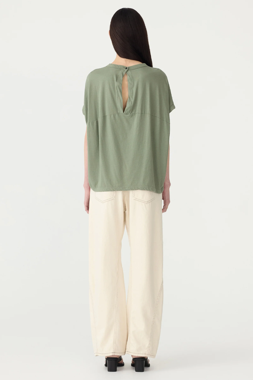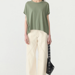 The Circle T-Shirt is a foundational wardrobe element relaxed by a subtle rounded silhouette. This relaxed tank boasts a curved hem detail and elongated capped sleeves. Refined by an open back detail with button closure. Complete with twisted side seams, oversized armholes and a heritage neck with bind.