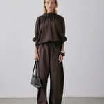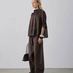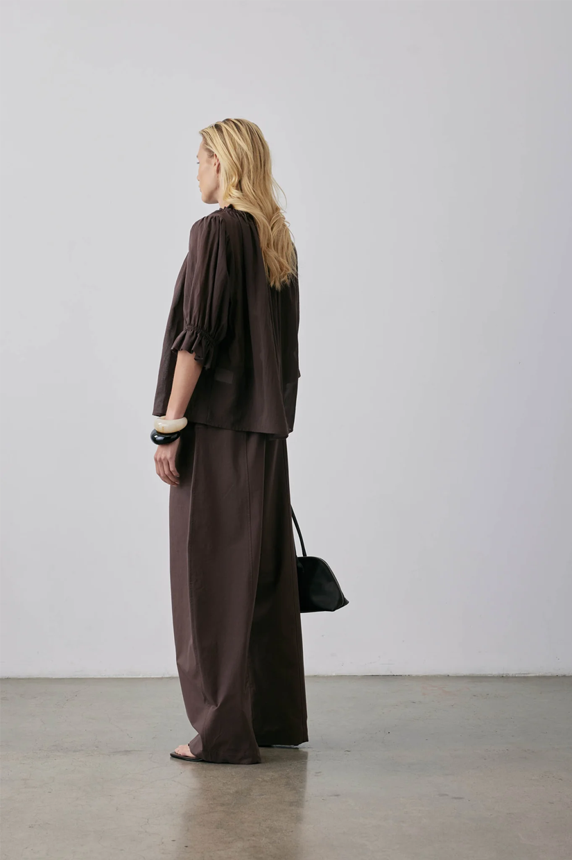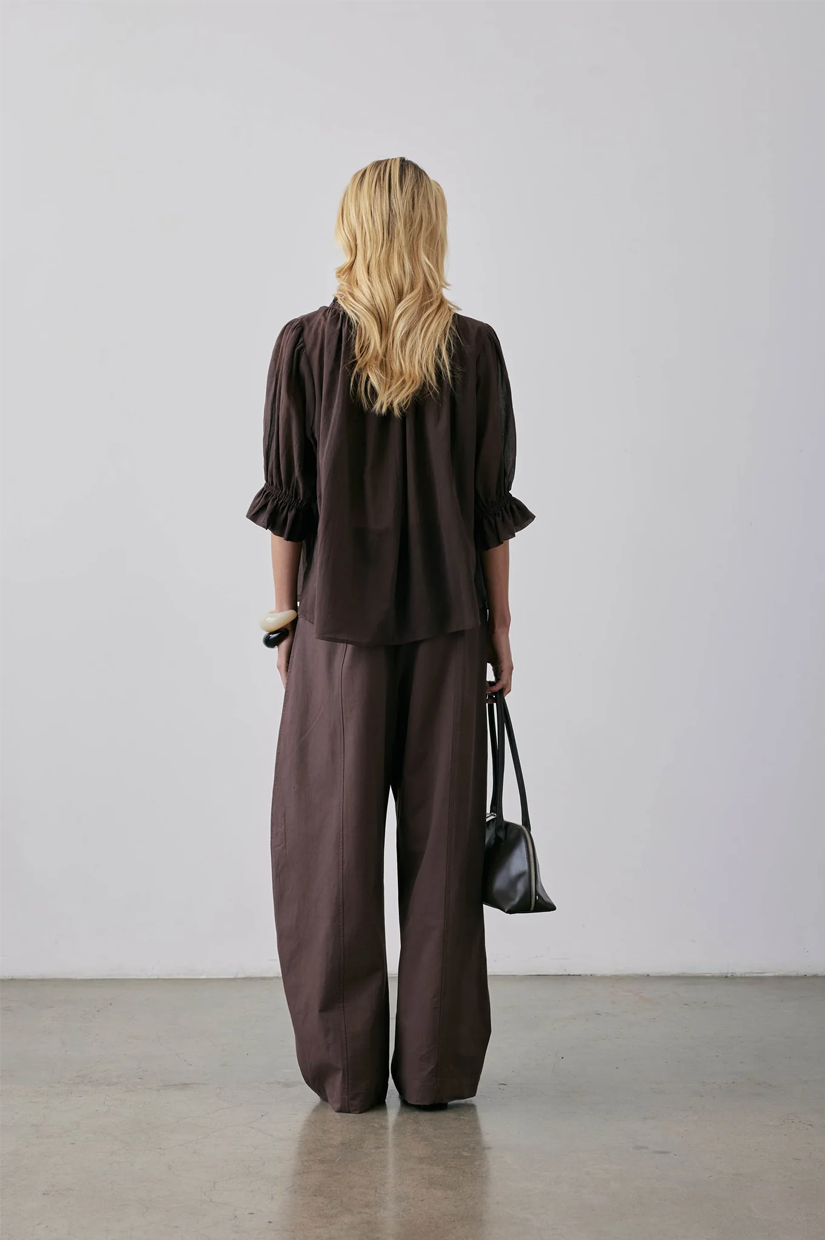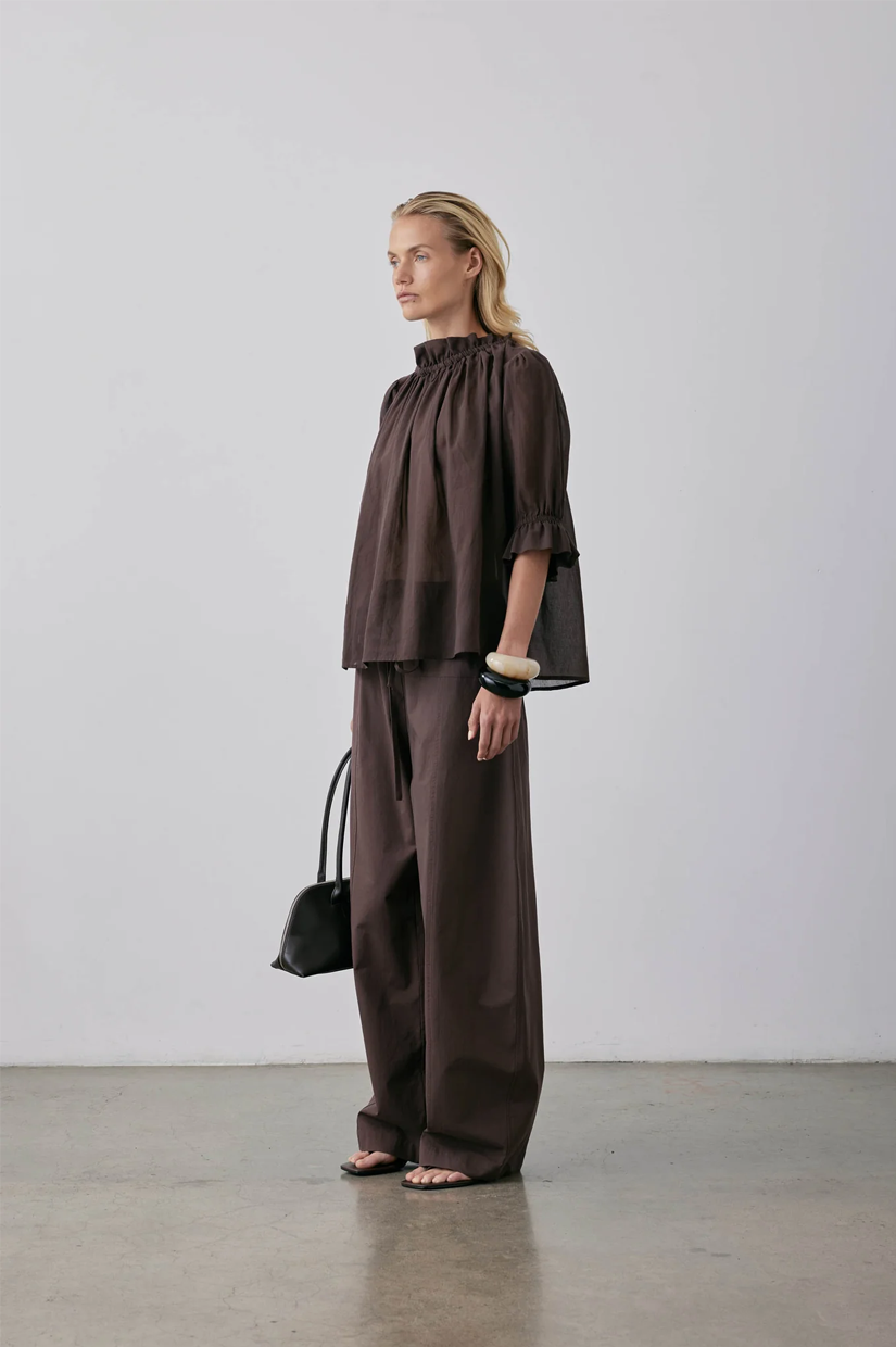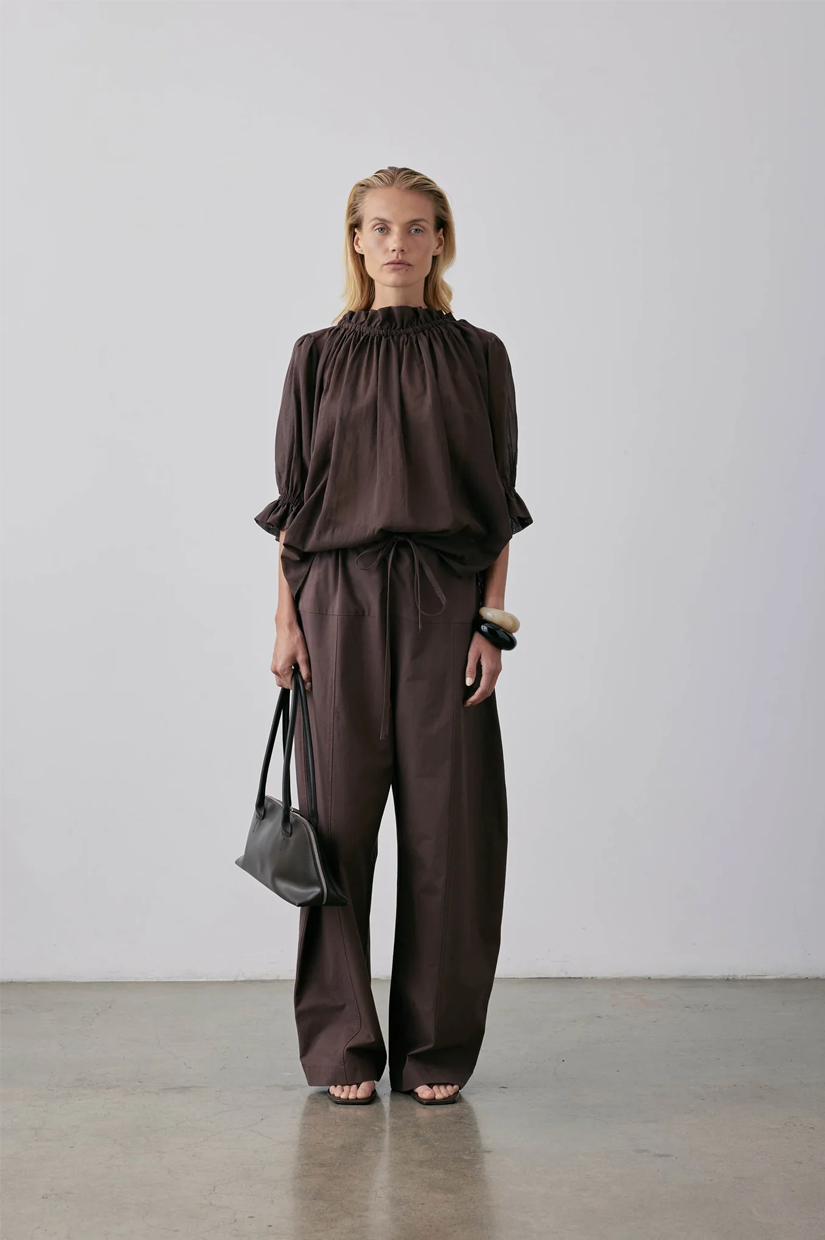 A short-sleeved blouse crafted from soft Japanese cotton in Barolo. The delicate fabric ensures a luxurious feel against the skin. This blouse features a fine elastic channel at the neck and sleeves, creating a gathered volume that adds a touch of feminine charm. Elevate your everyday look with the Peddle Top, a timeless addition to your wardrobe.