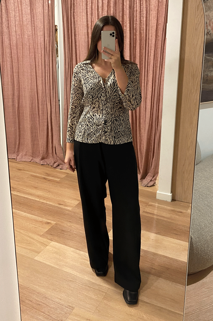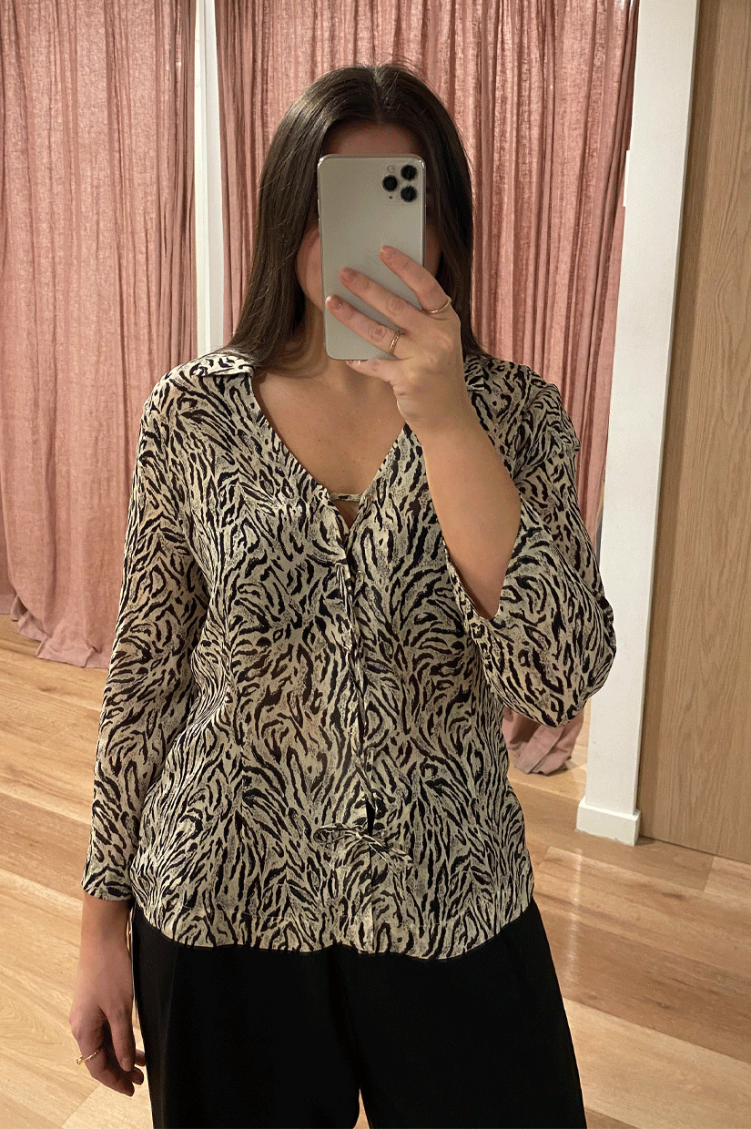 This Henny blouse is based on a vintage top from the seventies. We've mirrored the tie-front detail and neat collar.