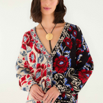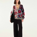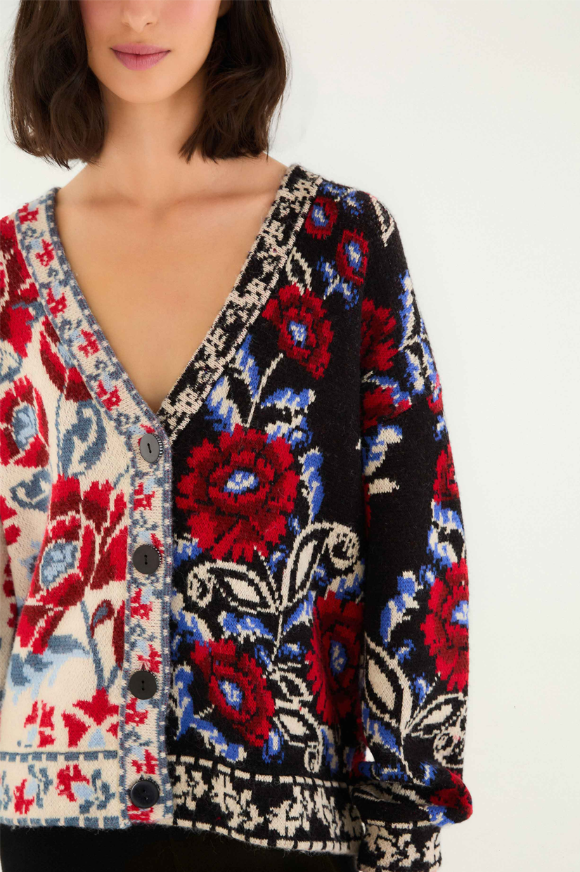 Embrace cozy elegance with the Black Mixed Valentina V Neck Knit Cardigan by FARM Rio. This playful piece features a striking jacquard floral pattern in bold reds, blues, and creams, beautifully divided between light and dark backgrounds. The relaxed silhouette and deep V neckline invite warmth and ease, while intricate borders add a touch of artistry. It’s a vibrant knitwear essential that feels like a gentle hug from the heart of Brazil.