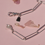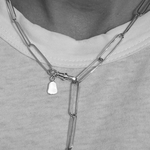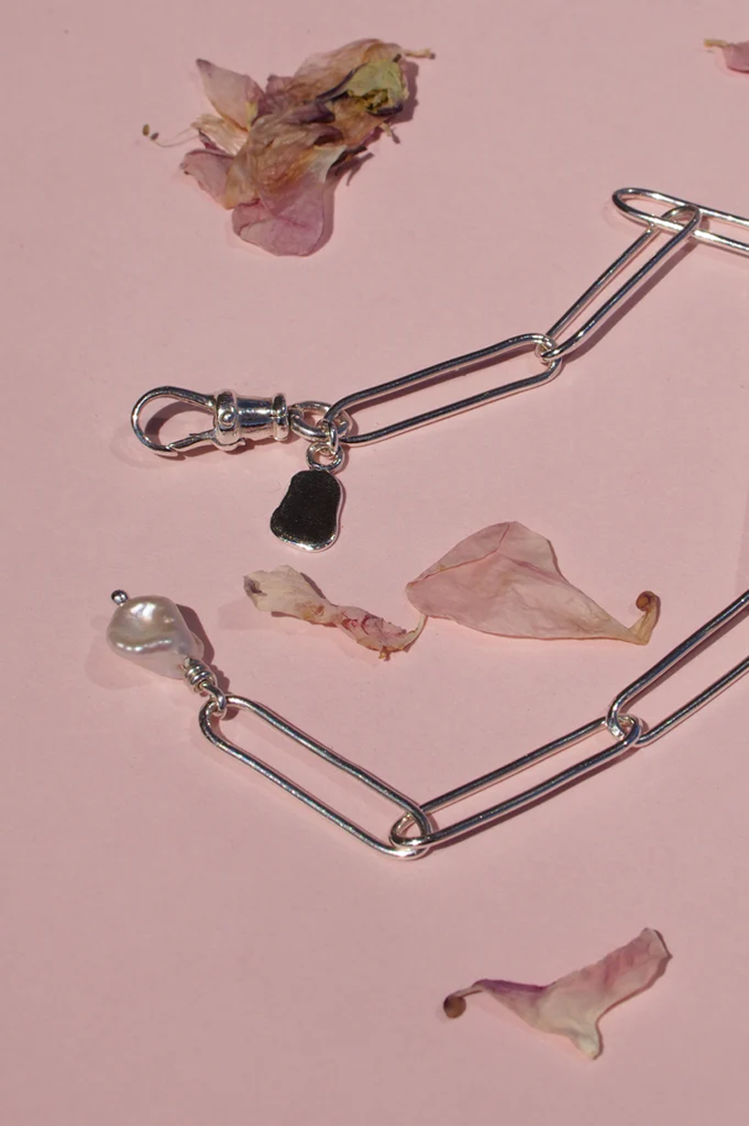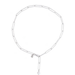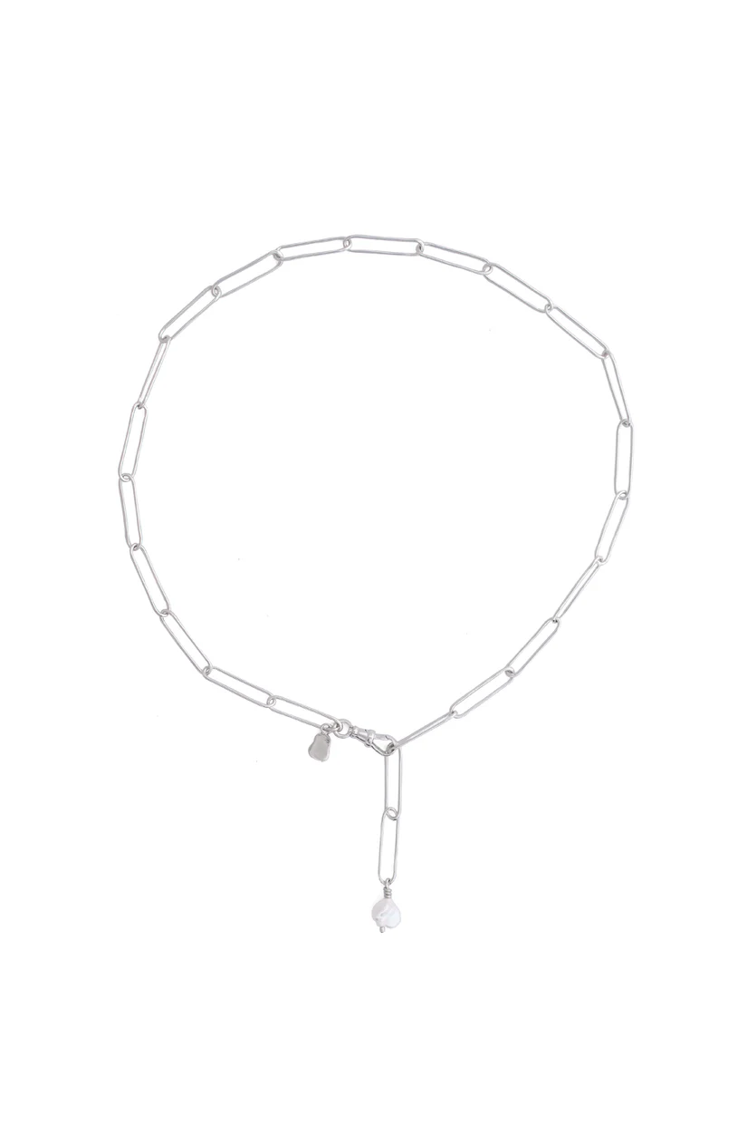 An elongated, handcrafted paperclip chain with an 8mm freshwater pearl hanging from one end. A swivel clasp can be attached at any length