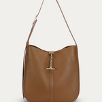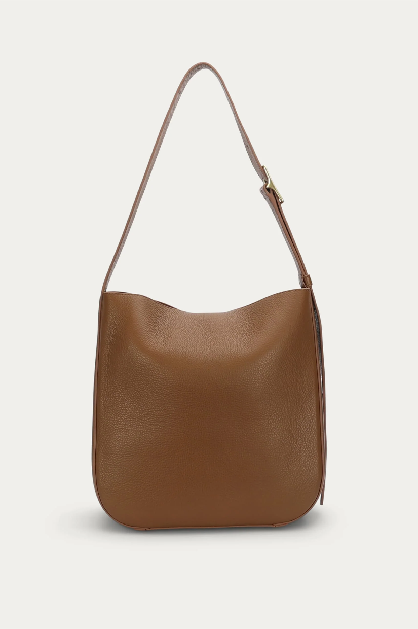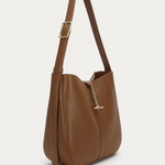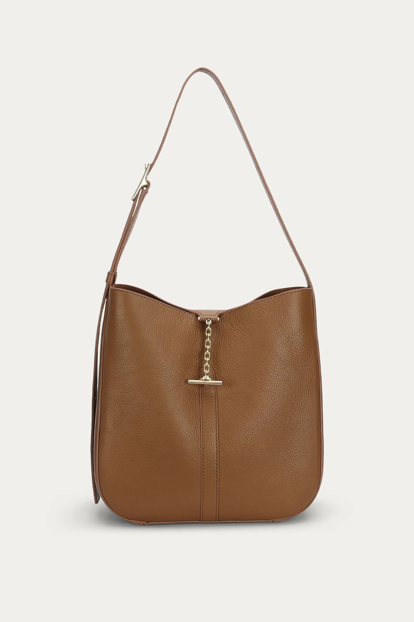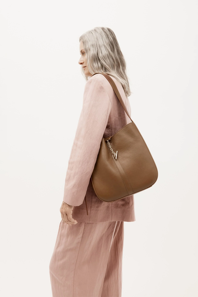 Mr Foldabit in Toffee is a structured tote crafted from Calf Nappa, LWG-certified. He features a chain and T-bar closure, an adjustable strap with a distinctive buckle, and a velvety suede interior with a detachable zip pouch.