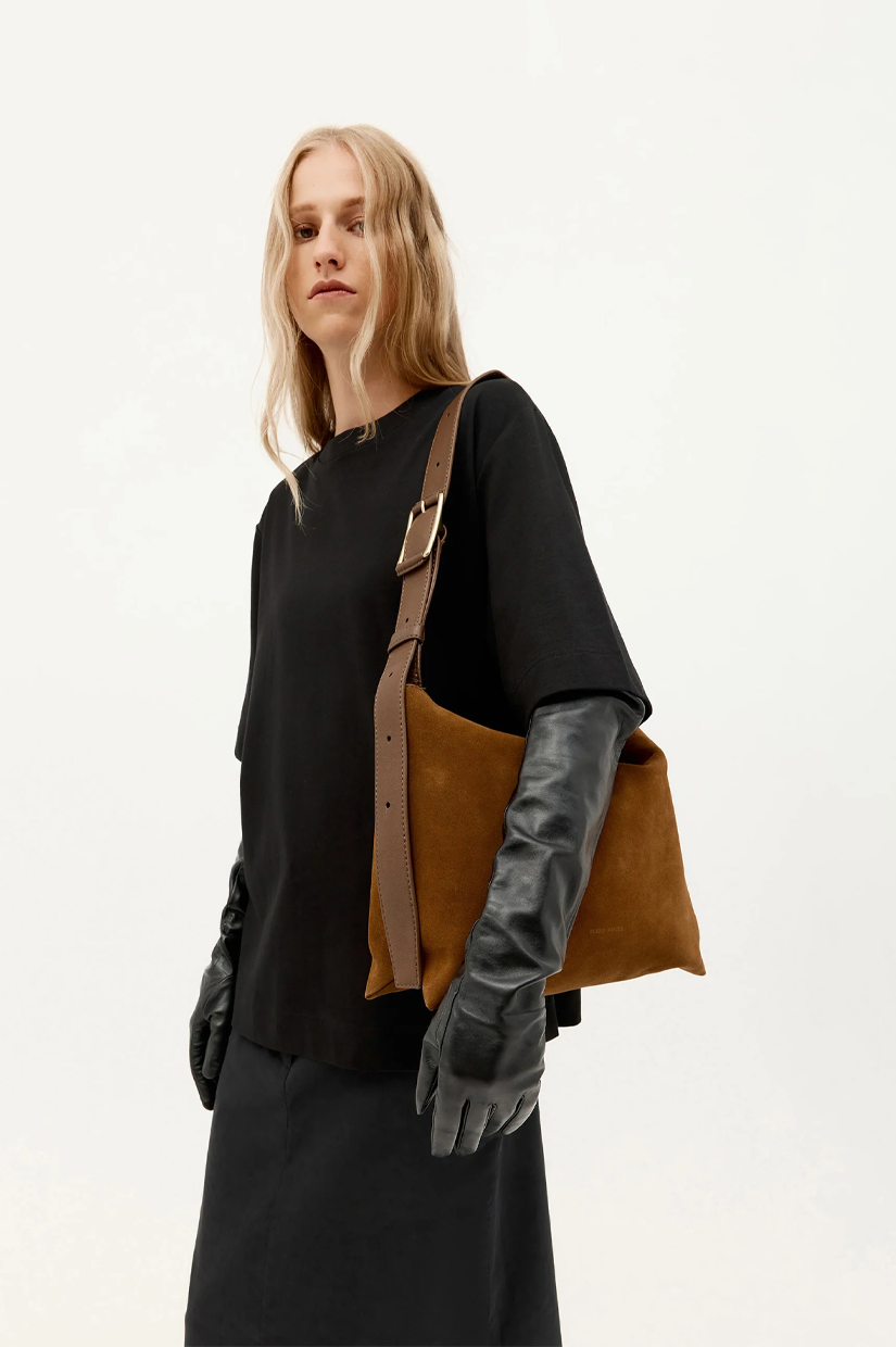 Mr Midimese in Gingerbread is crafted from supple Calf Suede and features a softly slouched silhouette with a zip closure, adjustable strap, and brass buckle. Inside, he’s detailed with two slip pockets, a zip pocket, and an internal key clip for added functionality.