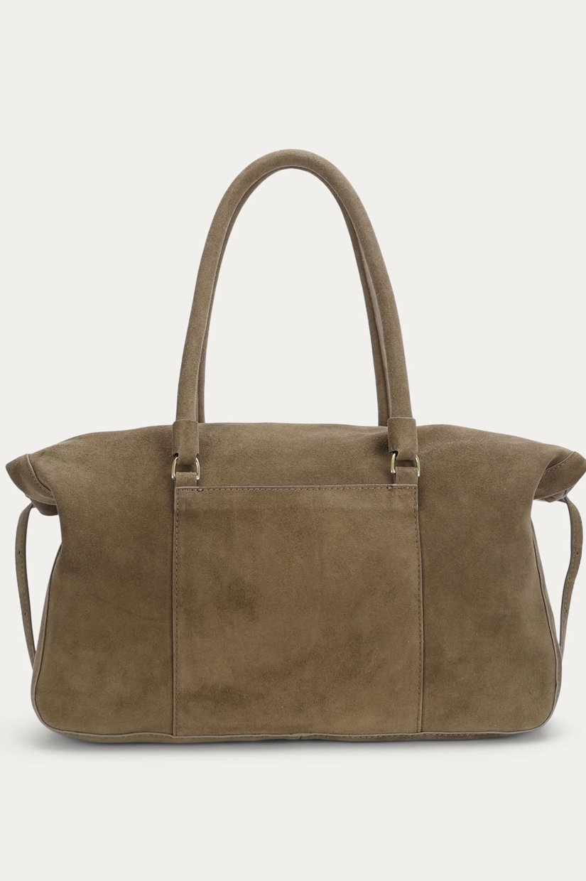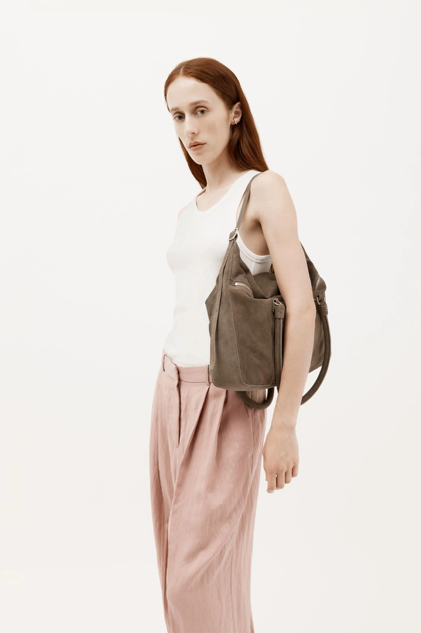Bold and spacious, Mr Miro in Donkey is crafted from LWG-certified Calf Suede with signature brass hardware. Featuring dual rope handles and an adjustable leather strap, he offers two distinct carrying options.