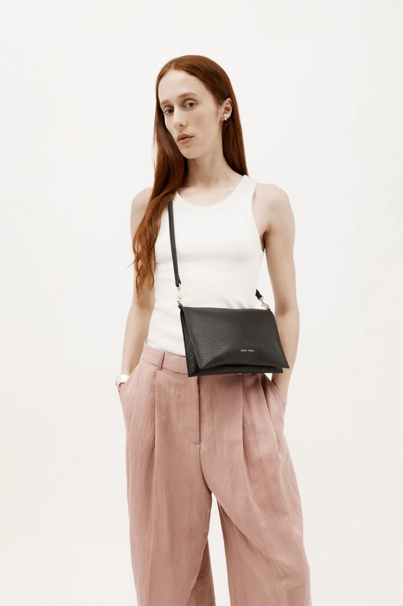 A Deadly Ponies favorite, Mr Siamese is intricately handcrafted with a single piece of New Zealand Merino Lamb leather, folded to form his streamlined silhouette. Featuring a detachable, adjustable crossbody strap and a detachable front-facing brass chain; Mr Siamese can be worn as a clutch, on the shoulder, or as a crossbody.