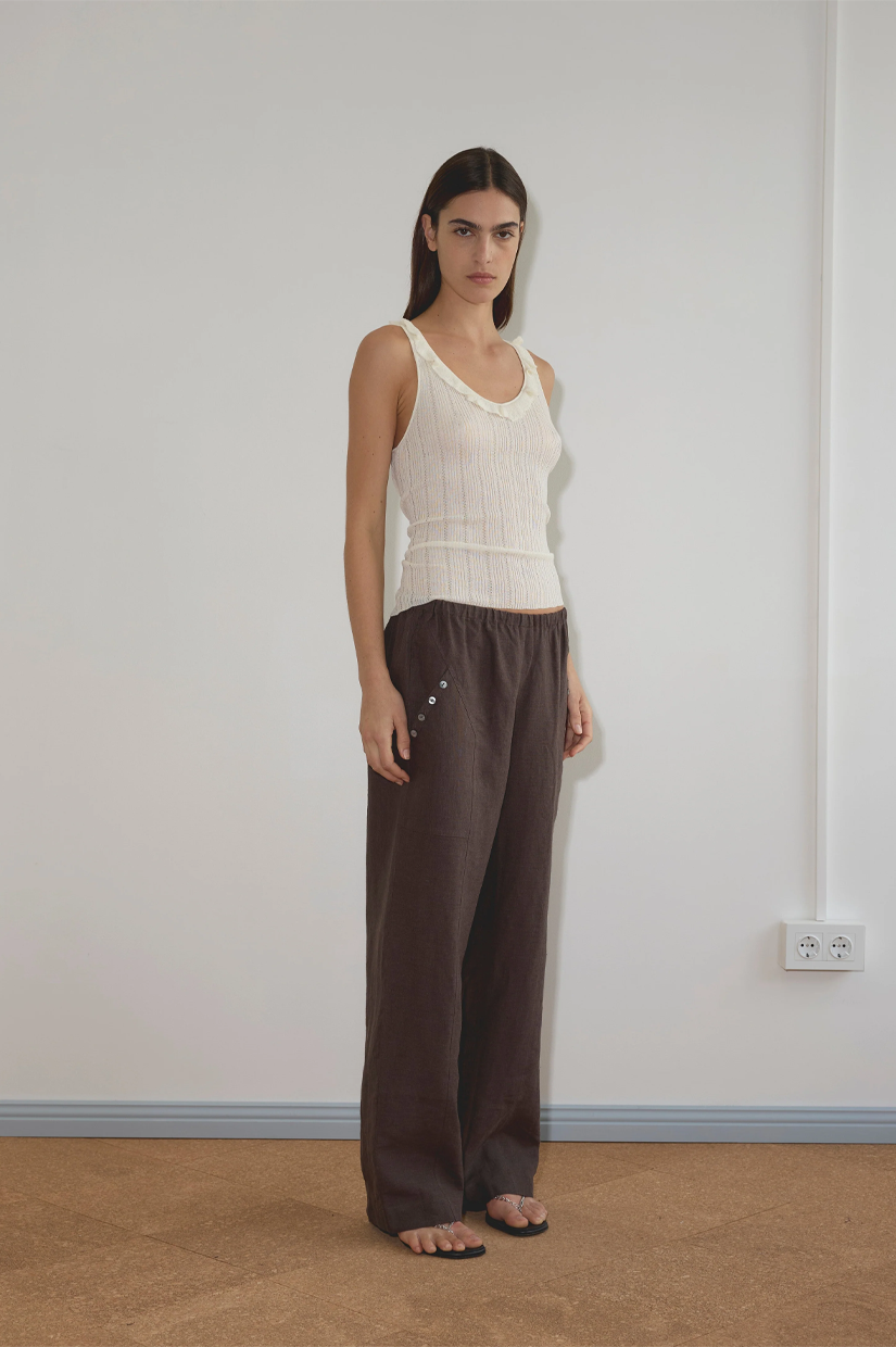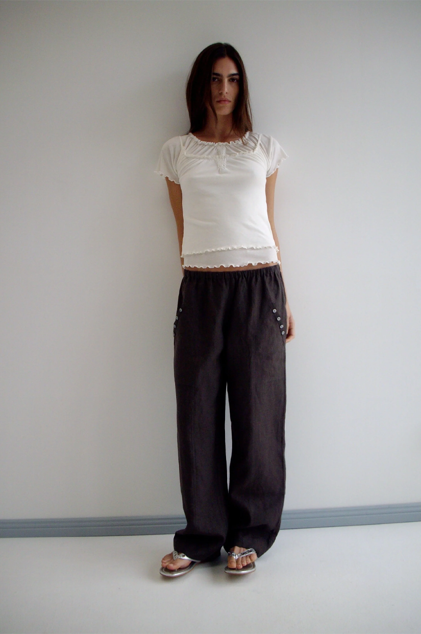 a relaxed low to mid rise, ankle length pant features a soft minimal elastic waist, front seam pockets with button detail in a straight leg