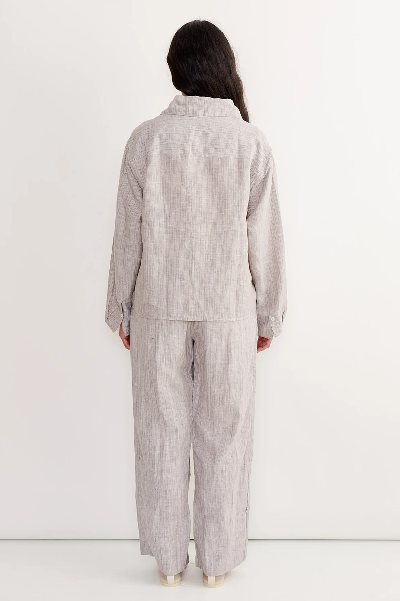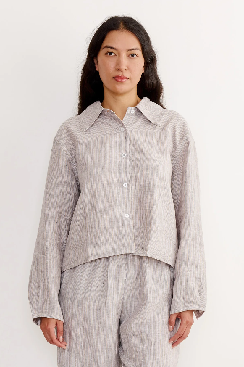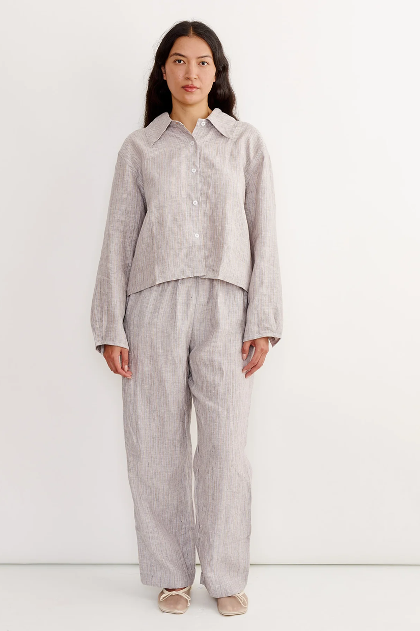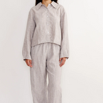 The Deiji Collar Set in Haze Blue features a classic crisp button up shirt in a boxy fit, with a dropped back yoke, dropped shoulders and a classic shirting cuff. The matching, relaxed mid-waist pant features an elasticated waistband with double side seam in a wide leg.