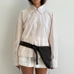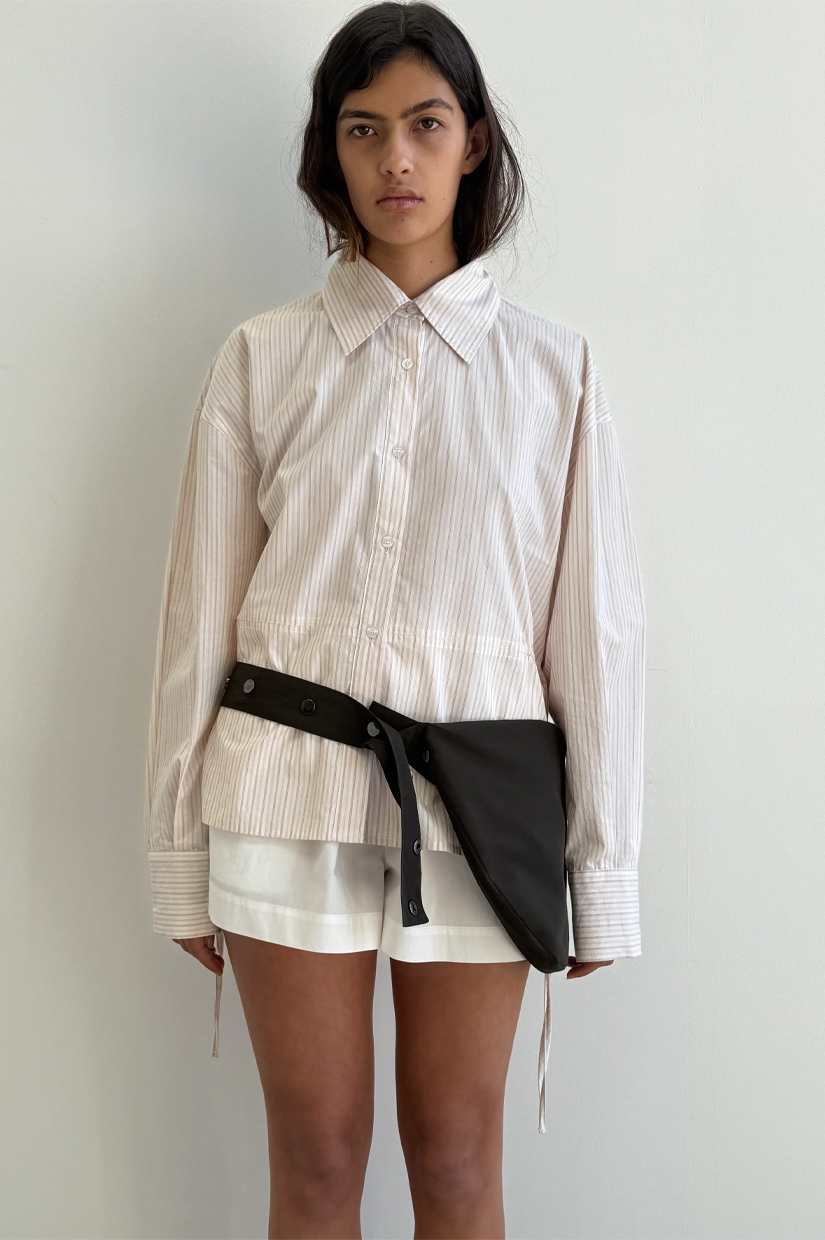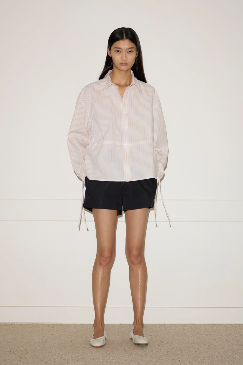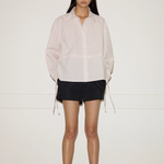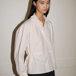 a structured long sleeve shirt featuring a button-up front, wide set shoulder, and soft stand collar. finished with design line seam detailing, sleeve tab button accents, and a drawcord waist ties for an adjustable shape.