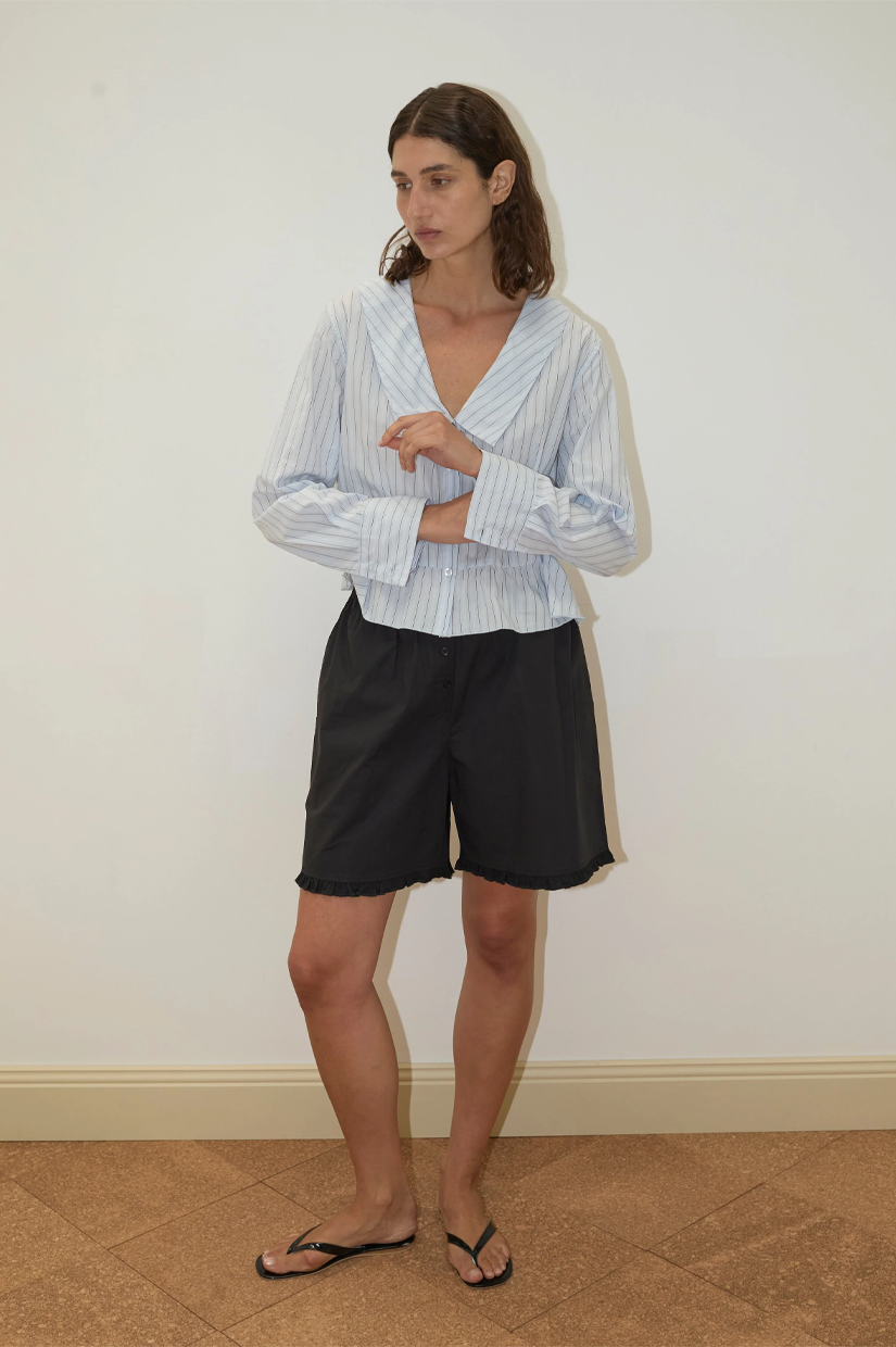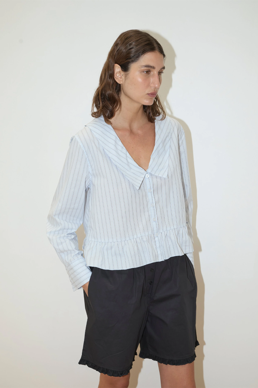a classic crisp button up shirt in a structured fit, featuring a dropped back yoke, bind sleeve finish and babylocked frill hem
