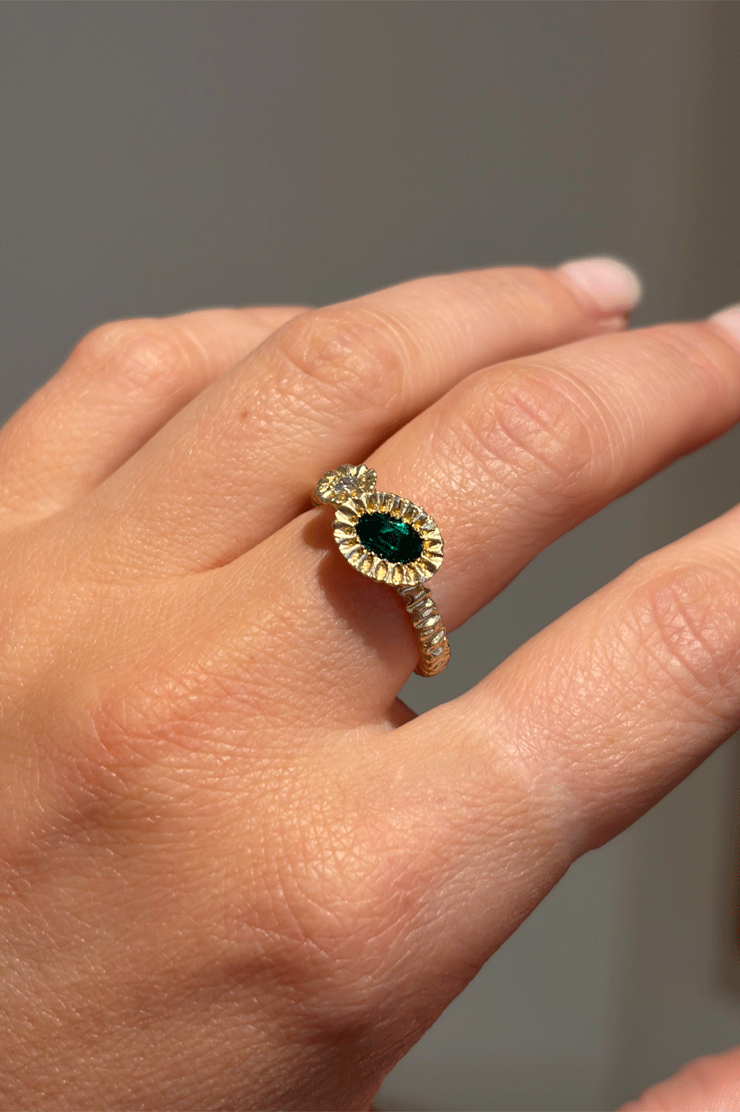 Alexandra Dodds Asymmetric Teeth Gem Ring 9ct Gold Lab Emerald