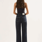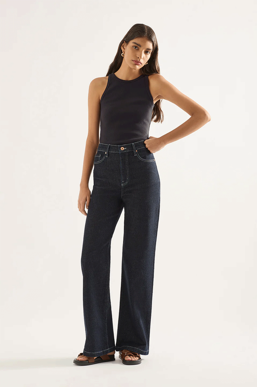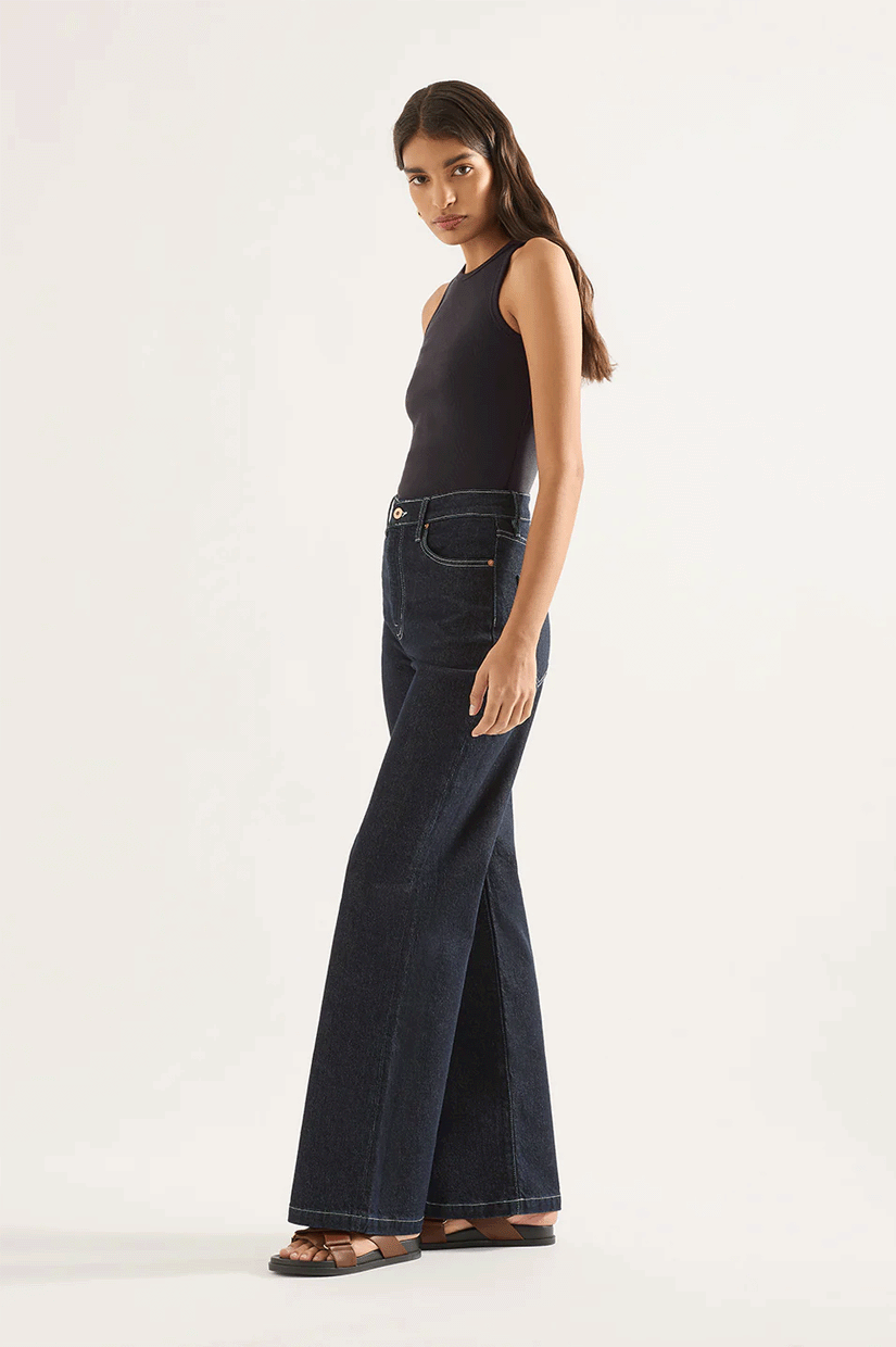 Retro-inspired cut that hugs through waist and relaxes into a full length wide leg silhouette.