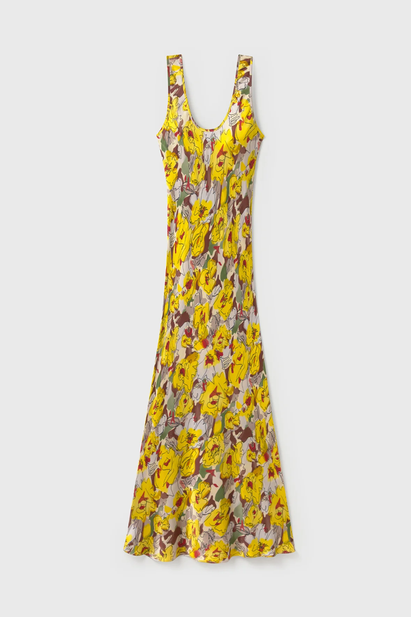 Silk Laundry Scoop Neck Dress, made from 100% silk. Sleeveless with a scoop neckline. Cut on the bias with an ankle length hemline.