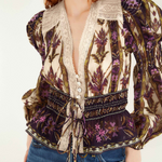 Embrace gentle elegance with the Sand Embroidered Tapestry Long Sleeve Blouse. This enchanting top features a playful V neckline adorned with delicate lace trims, while the rich tapestry-inspired embroidery bursts in calming purples and earthy tones. Voluminous sleeves gather softly at the cuffs, and a cinched waist with intricate smocking and tassel ties sculpts a flattering silhouette. Perfect for those who cherish artful details wrapped in warmth and charm.