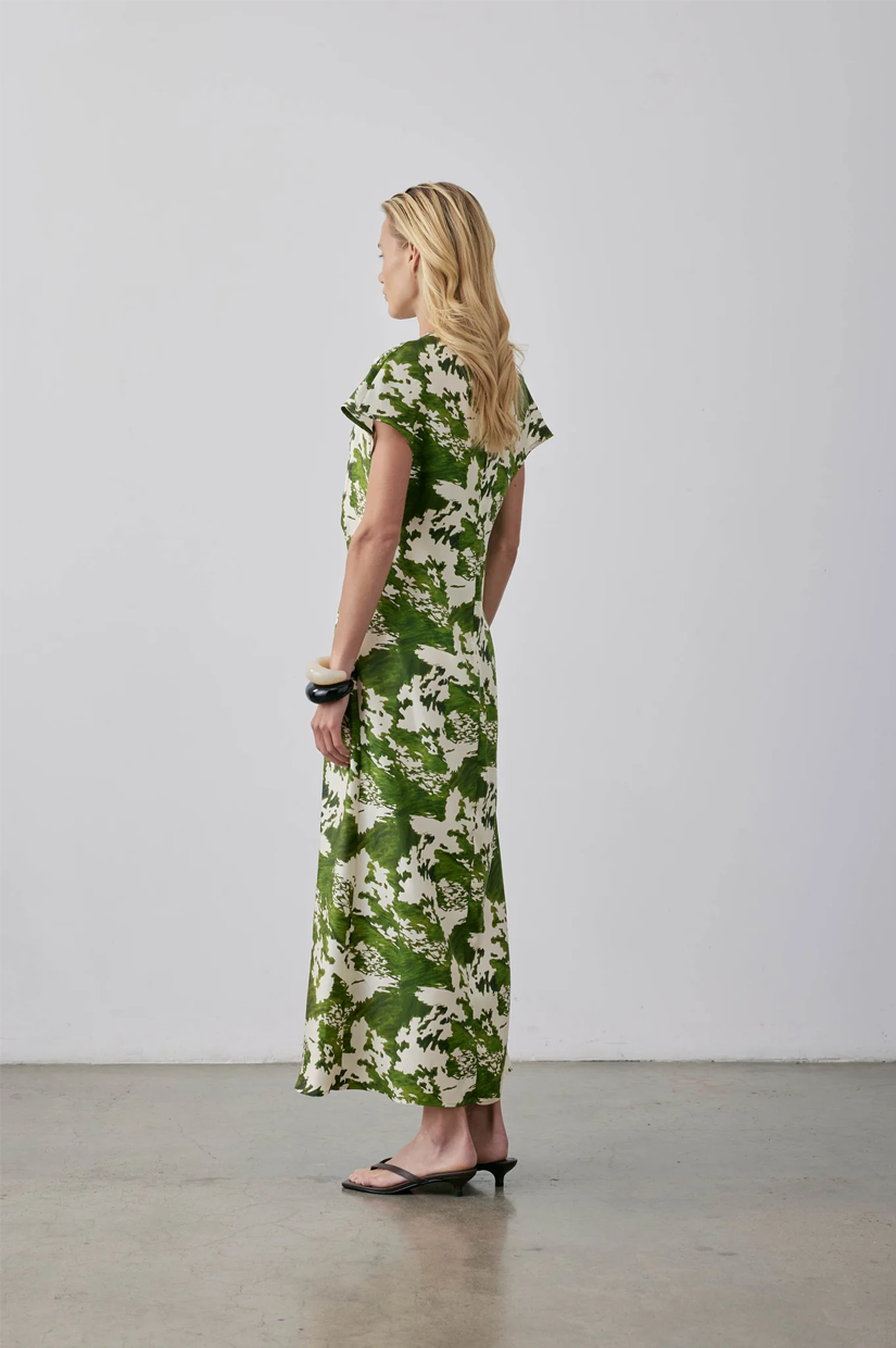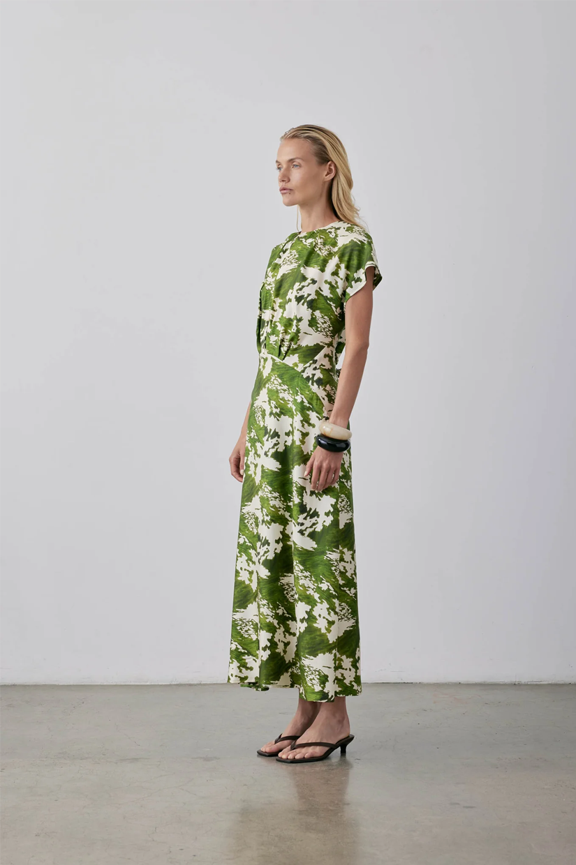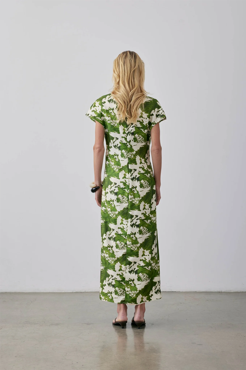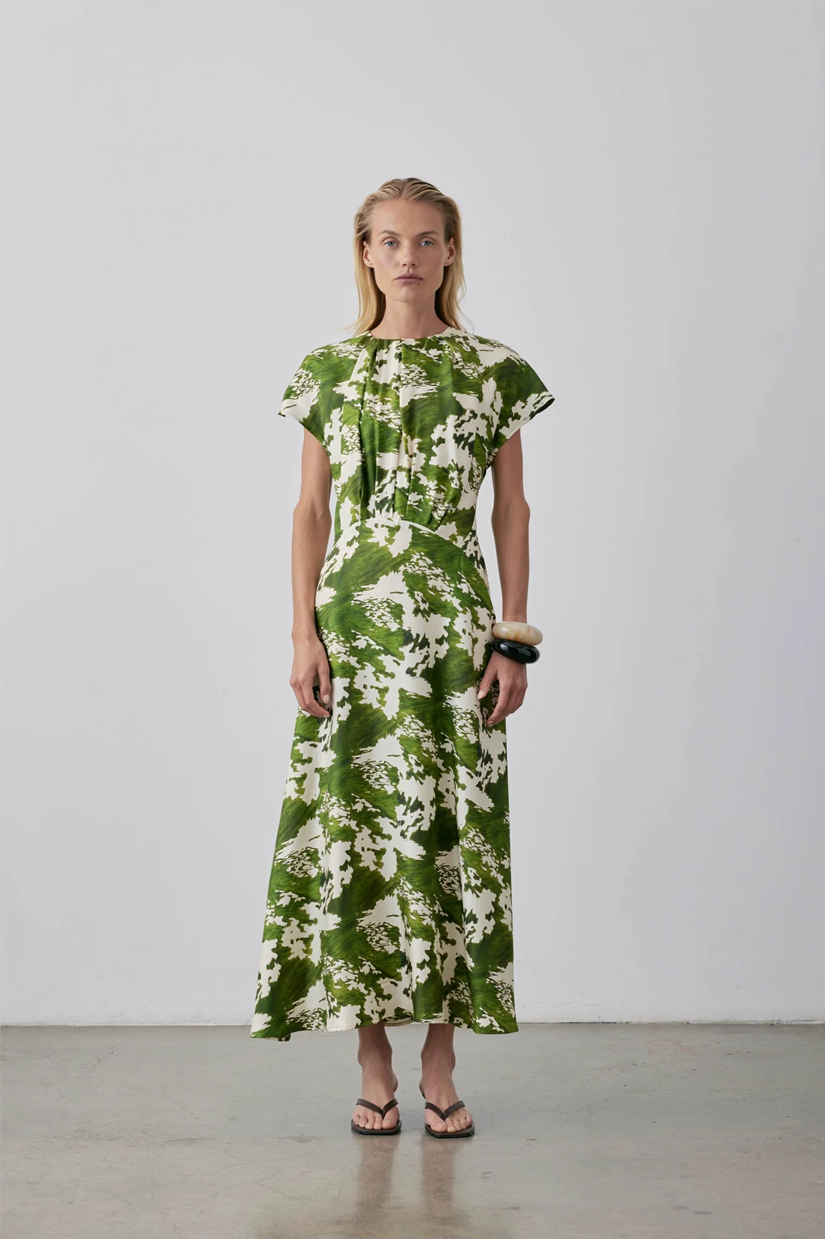Expertly crafted from luxurious silk twill, the Julio Dress features delicate cap sleeves and elegant pleat detailing surrounding the neckline. Its curve-enhancing silhouette, completed by a curved front waist seam and mid-length skirt, is perfected by a convenient back zip fastening. Exclusive Fern print.
