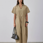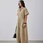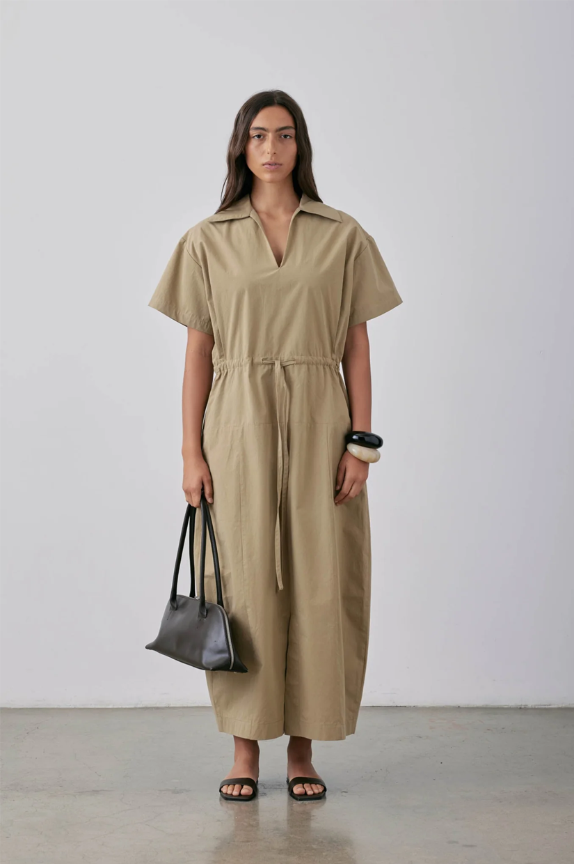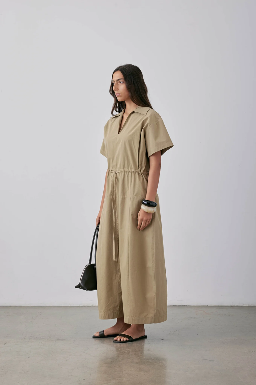 The Sion Dress SS25 is made from sand cotton poplin, delivering lightweight comfort. It features a spread collar, precise panelling, and a drawstring tie waist that allows for a customizable, tailored fit. This expertly designed dress combines refined details with functional style, making it versatile for warm weather wear while maintaining a polished appearance.