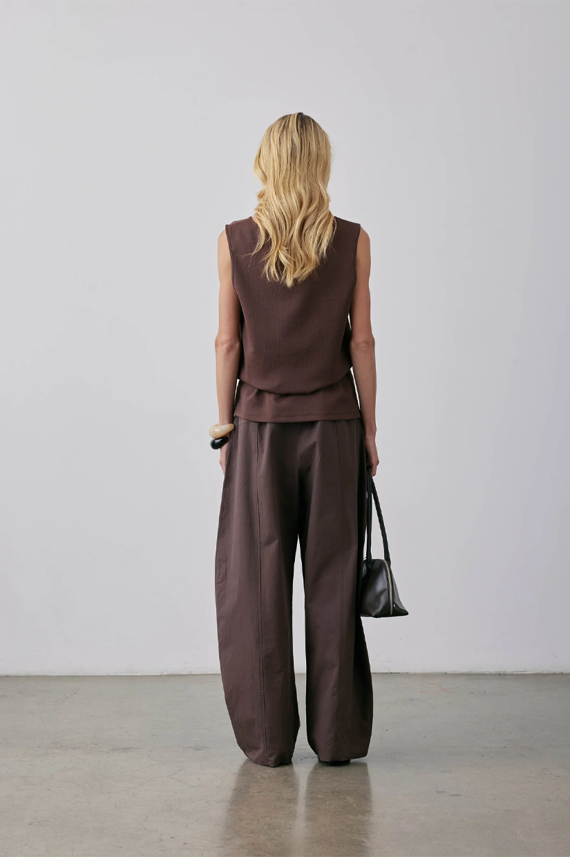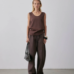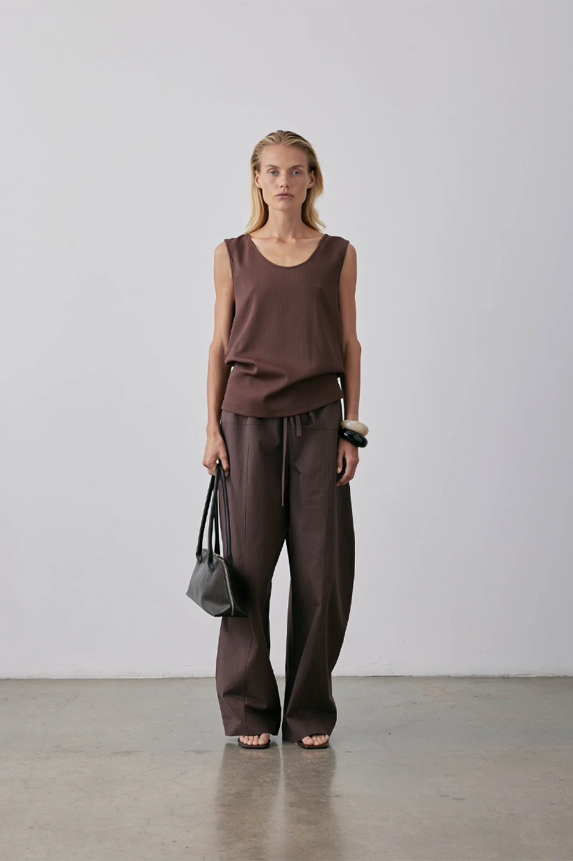 The Zaha Tank is made from a softly structured Japanese rib knit with a luxe drape and subtle stretch. Designed with a clean scoop neckline and wide shoulder coverage, it sits off the body without clinging, making it ideal for tucking or leaving loose. Perfect layered under tailoring or worn solo with wide-leg pants.