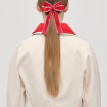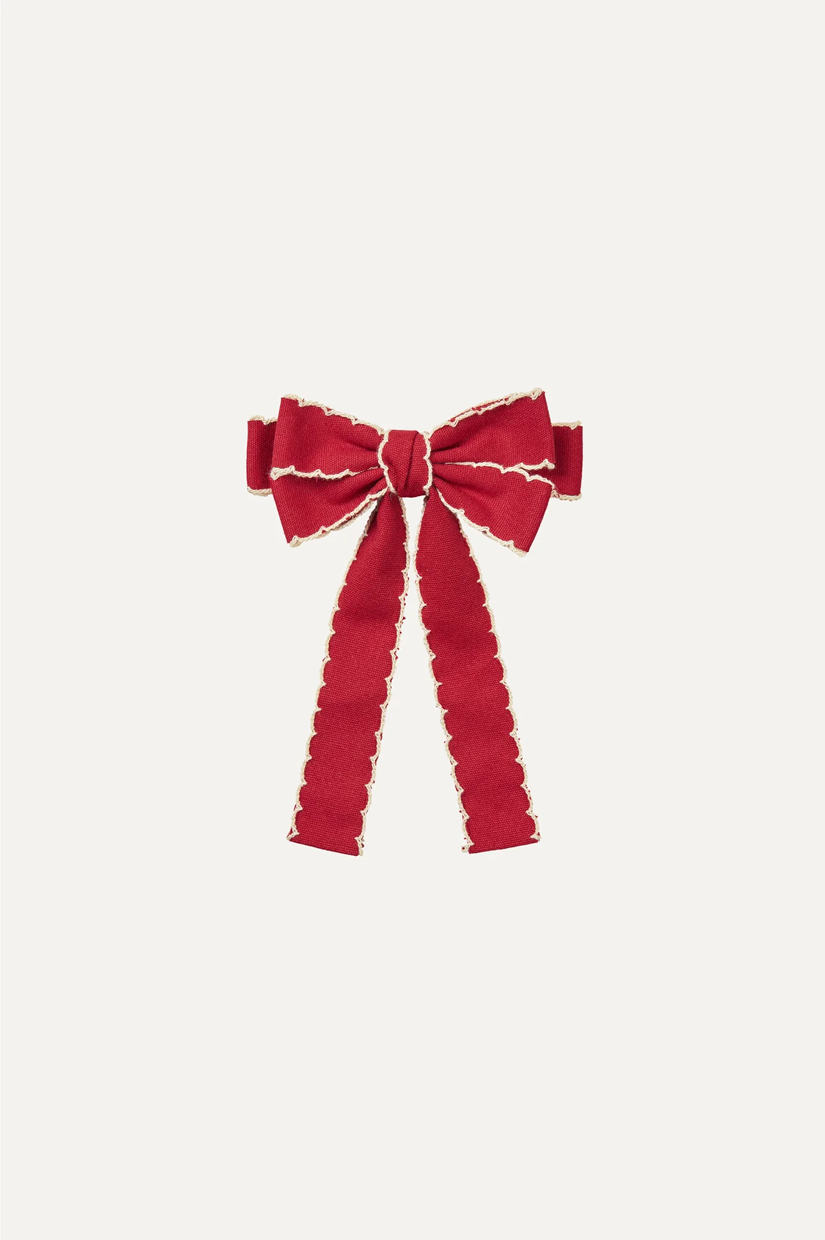 Hair clip with a decorative bow in red with scalloped white contrast edges. Detailed with an alligator clip for easy and secure fastening at the back.