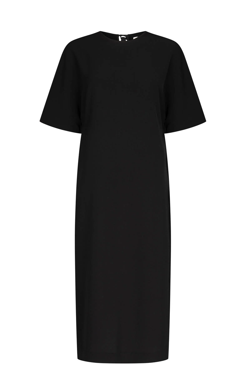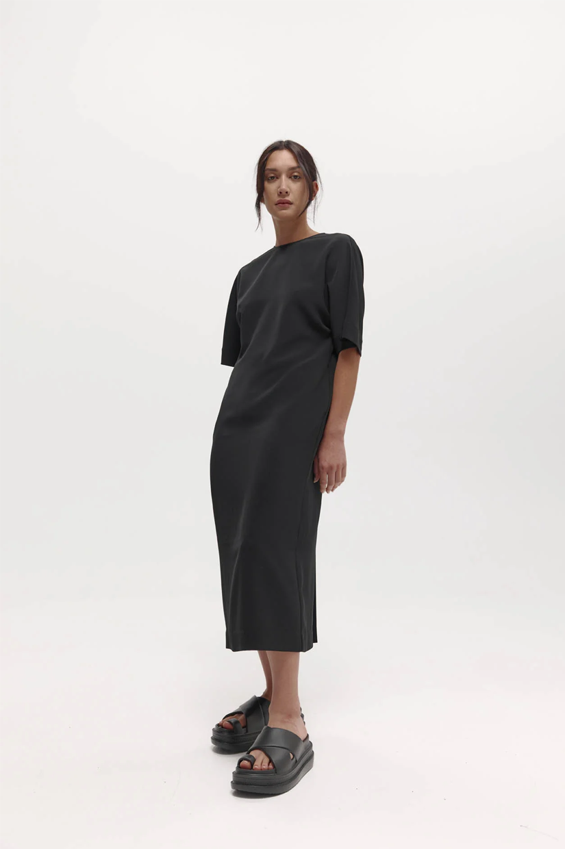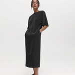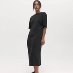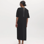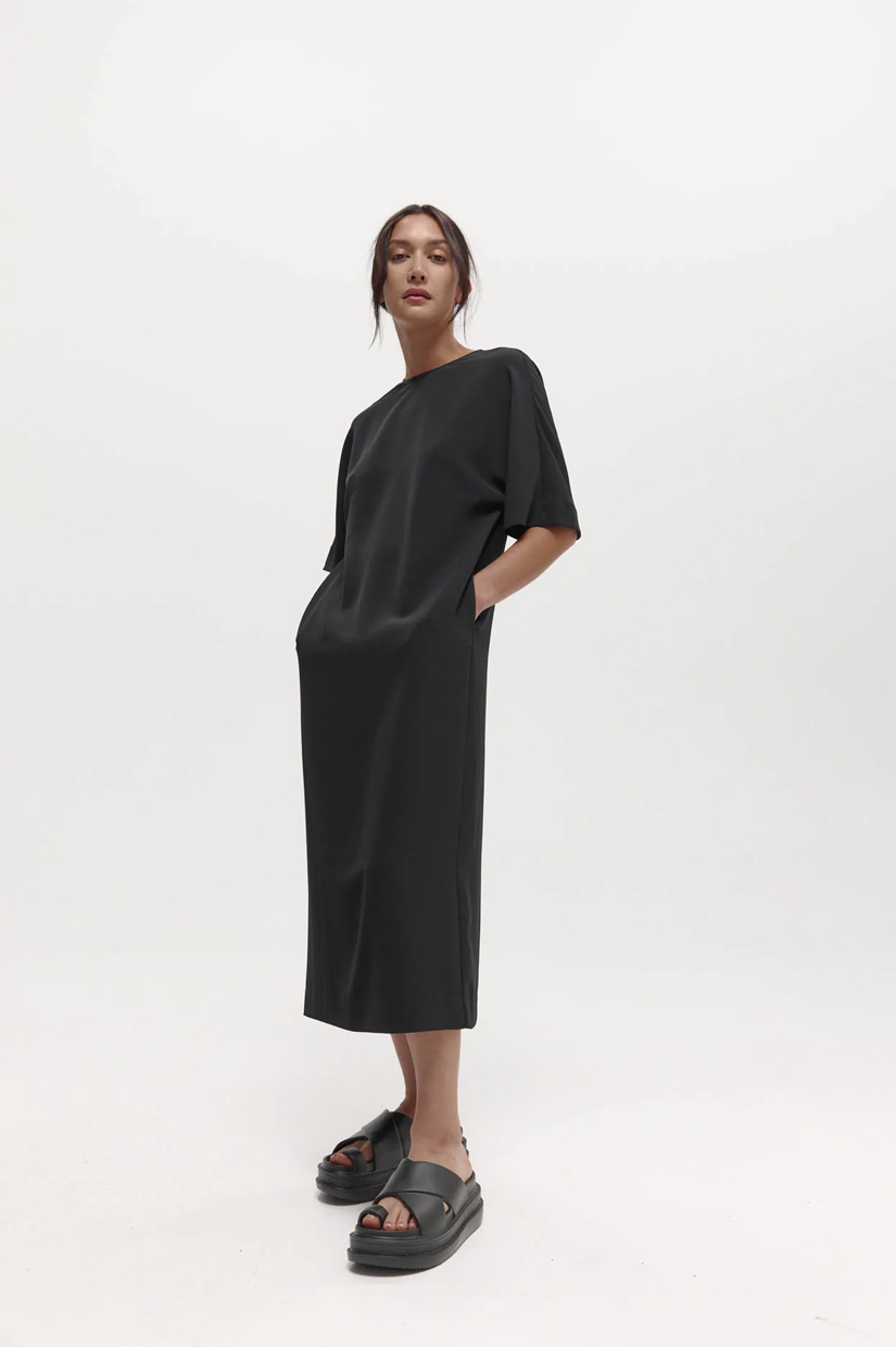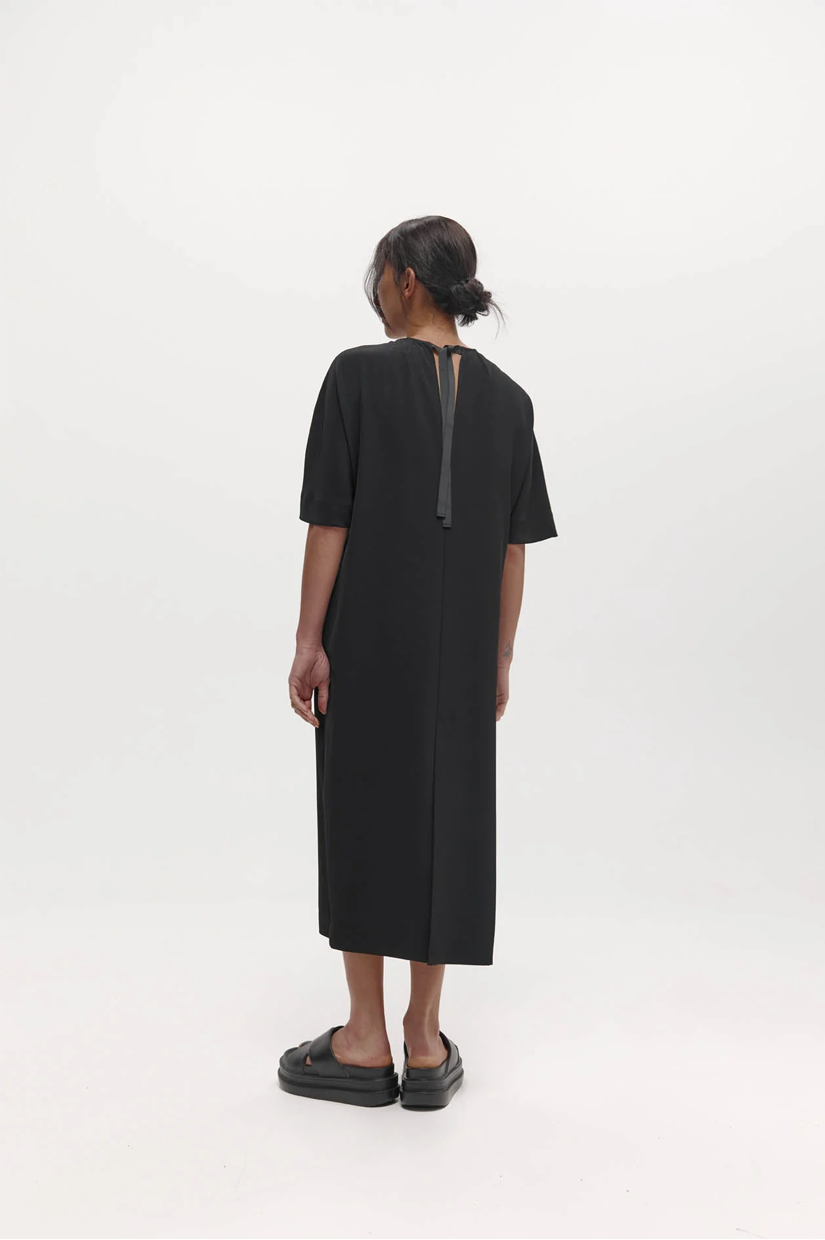 Cut for a relaxed flowing fit in drape suiting. An open back is secured by a grosgrain tie, while a back slit allows ease of movement. Finished with subtle pockets, the skirt falls to mid-calf.