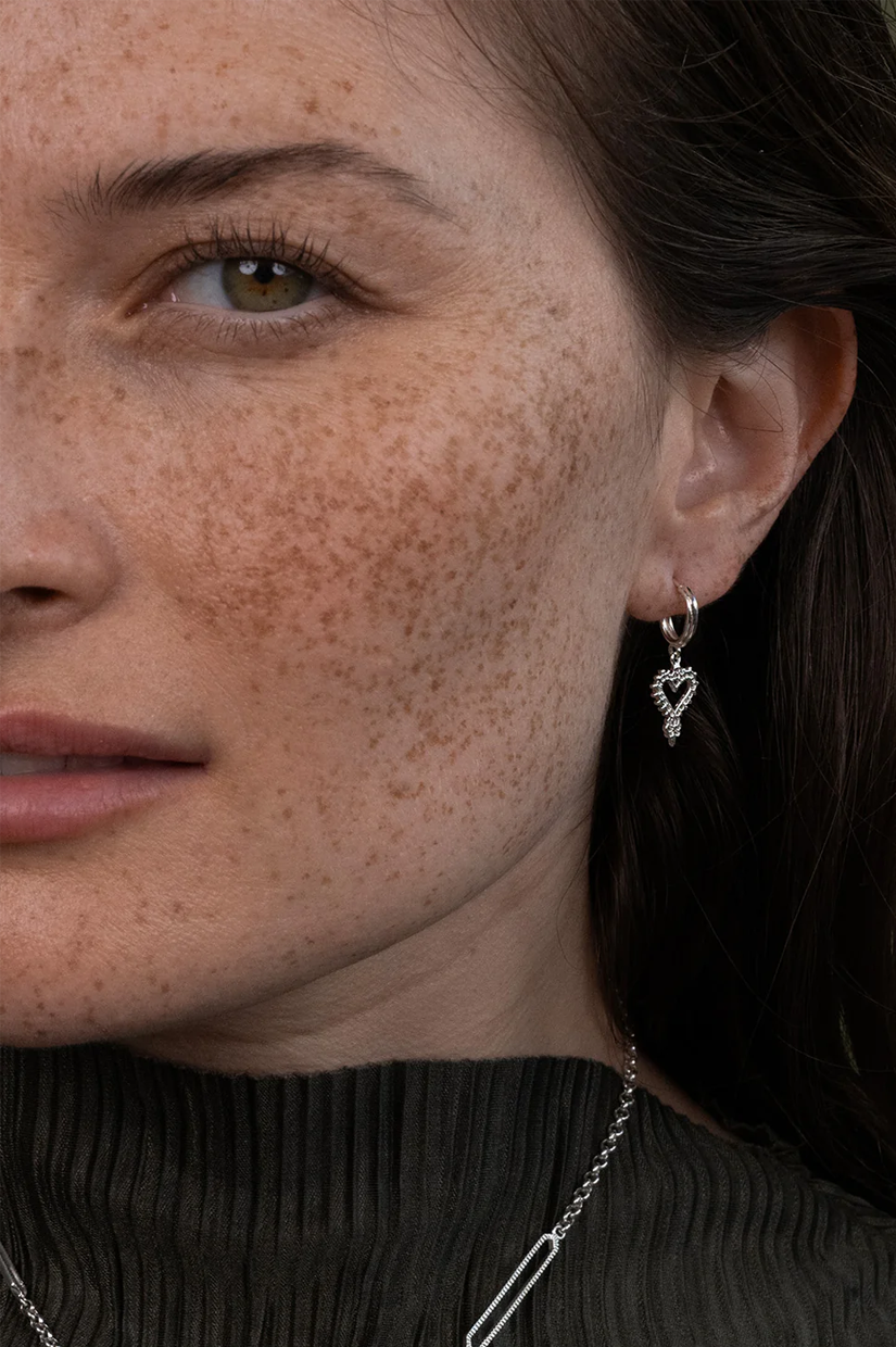 In celebration of our 20th Anniversary, we've reimagined a beloved classic, creating the Mini Gypsy Heart Hoops. These silver earrings feature a miniature heart pendant, gracefully suspended from a beautifully textured hoop. They gently sway, capturing the essence of bohemian grace and timeless romance.
