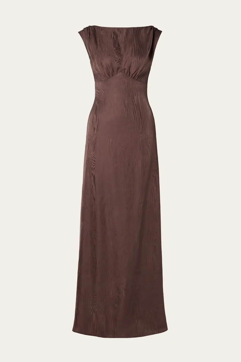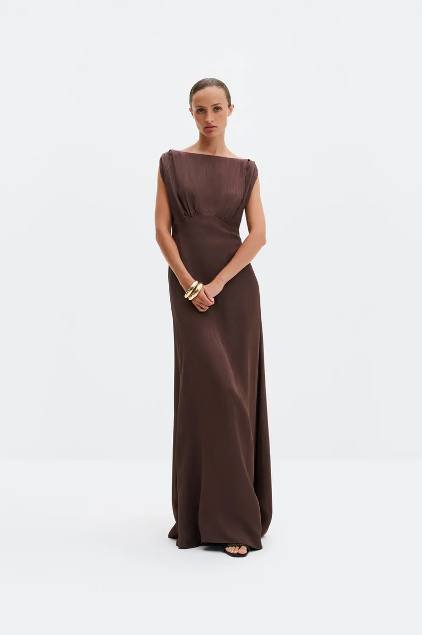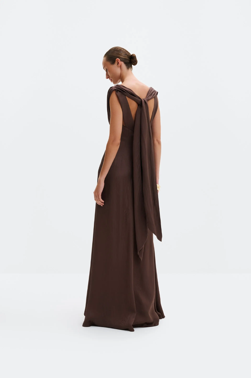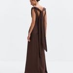 Maxi dress in satin Jacquard with pleated shoulders and a scarf detail that ties at the back.
