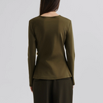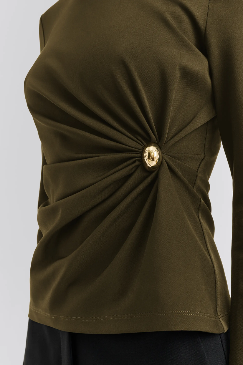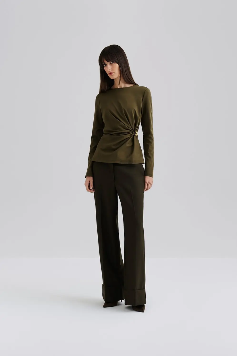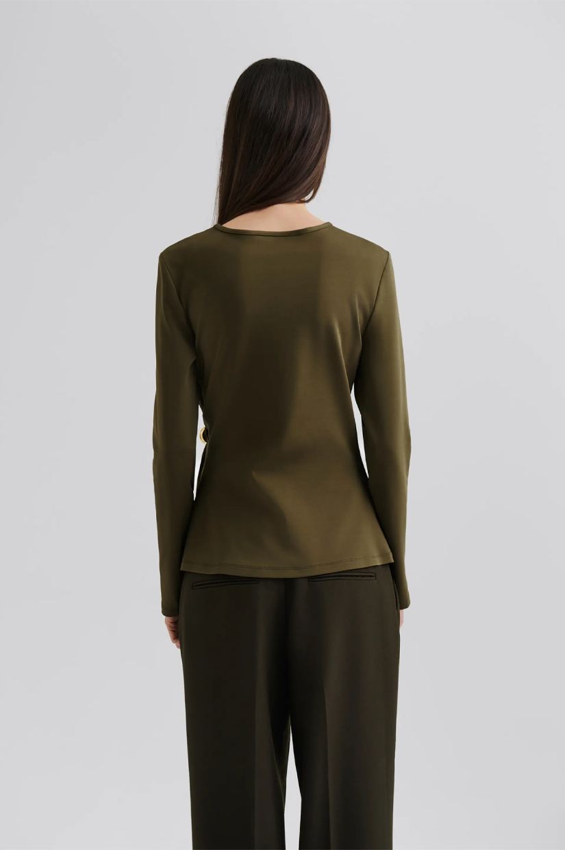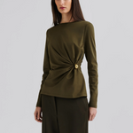 Long sleeved jersey top with gathered ruching at the waist and gold toned embellishment.