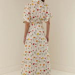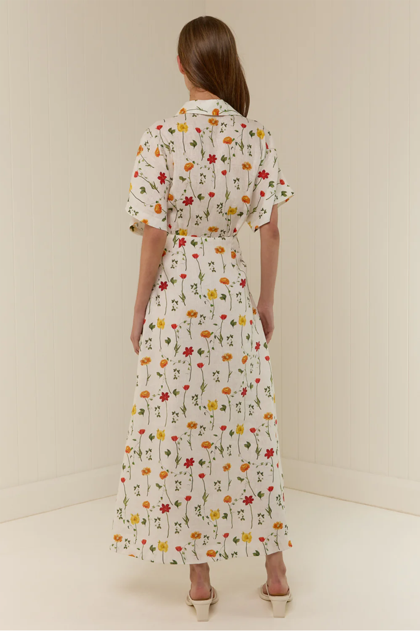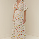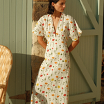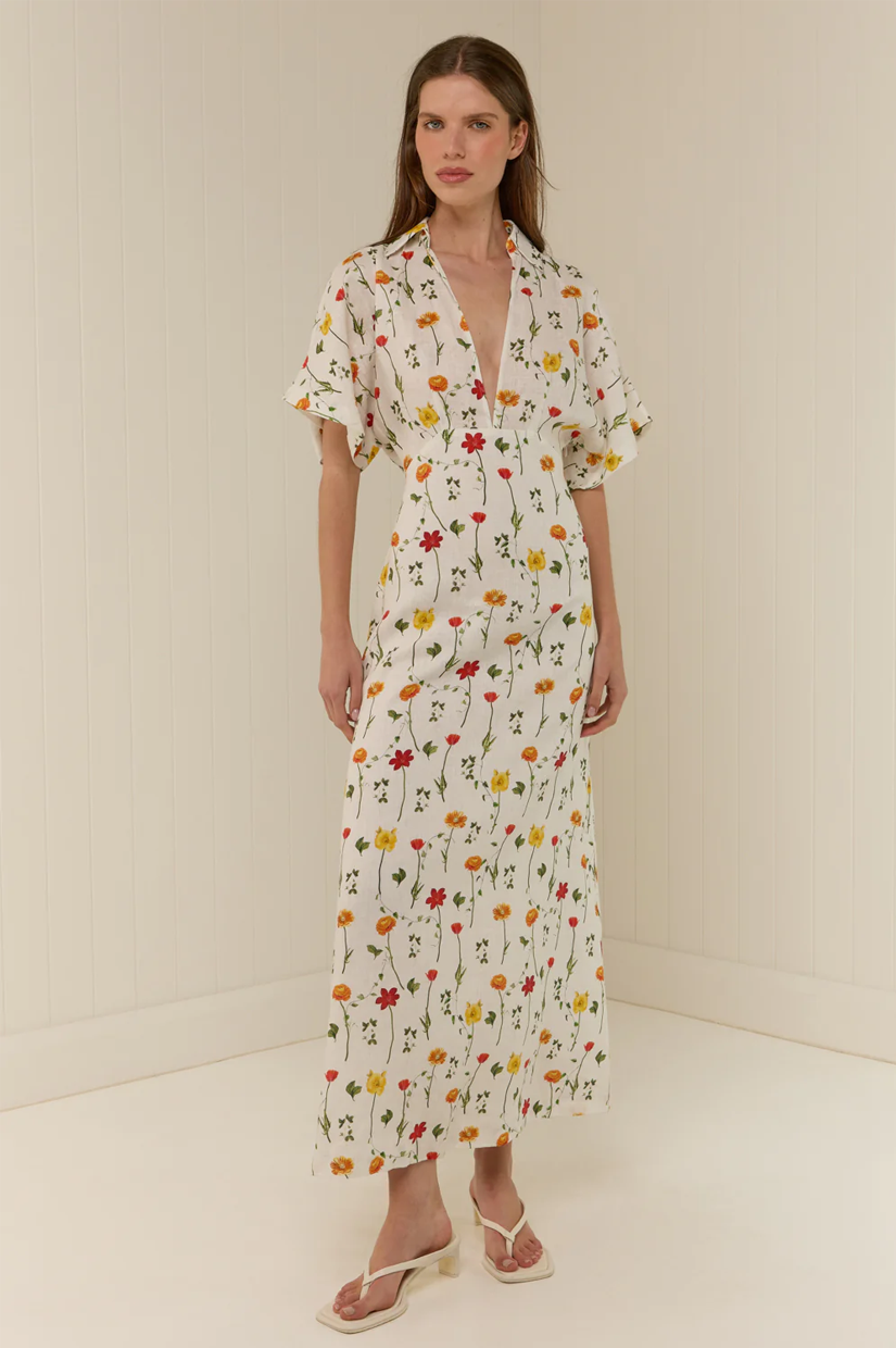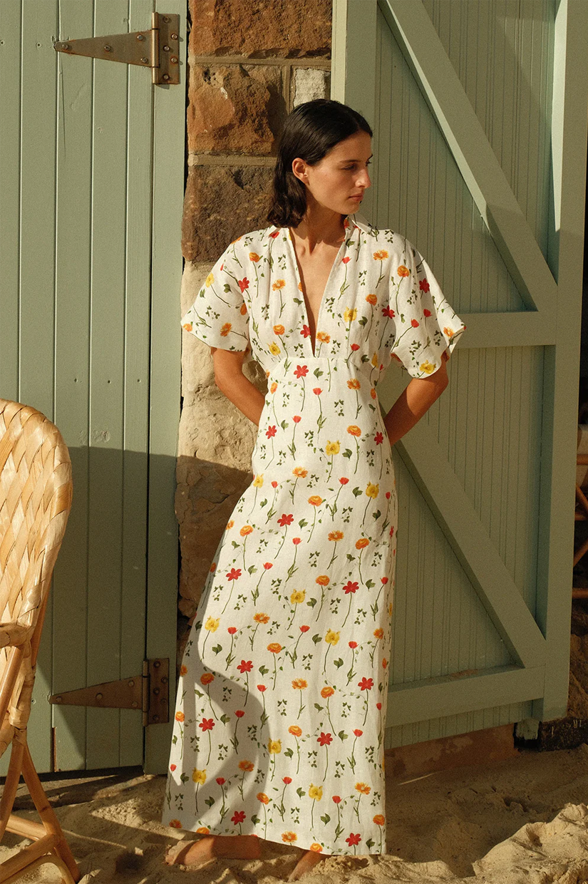 The Jasmine Dress is crafted from a premium Linen in our exclusive Garden Blooms print. Designed for a relaxed yet flattering fit, it features oversized sleeves that flow into a slim A line skirt. The neckline is a flattering deep V-shape, that features a hidden hook and eye for additional coverage if desired.