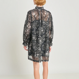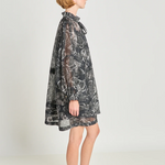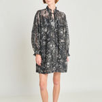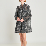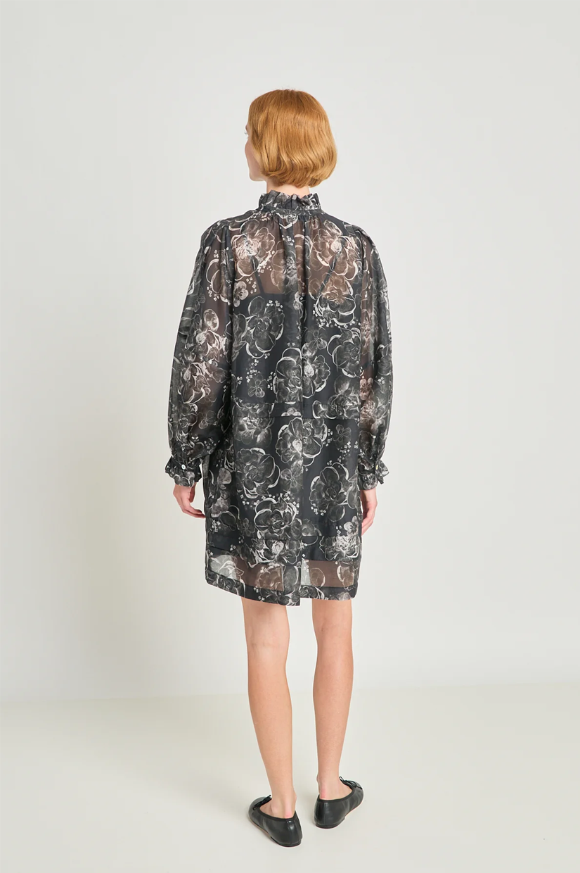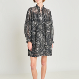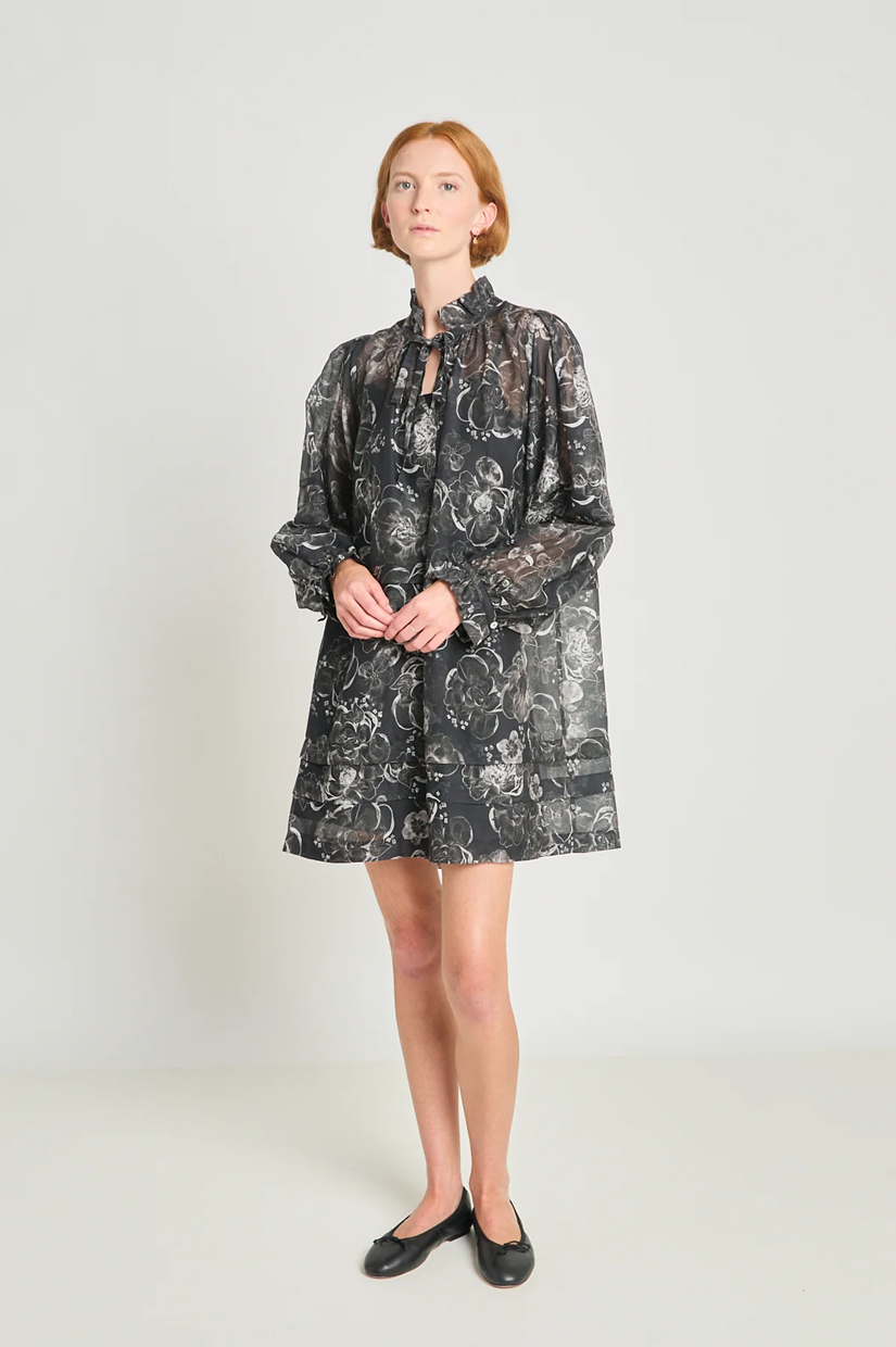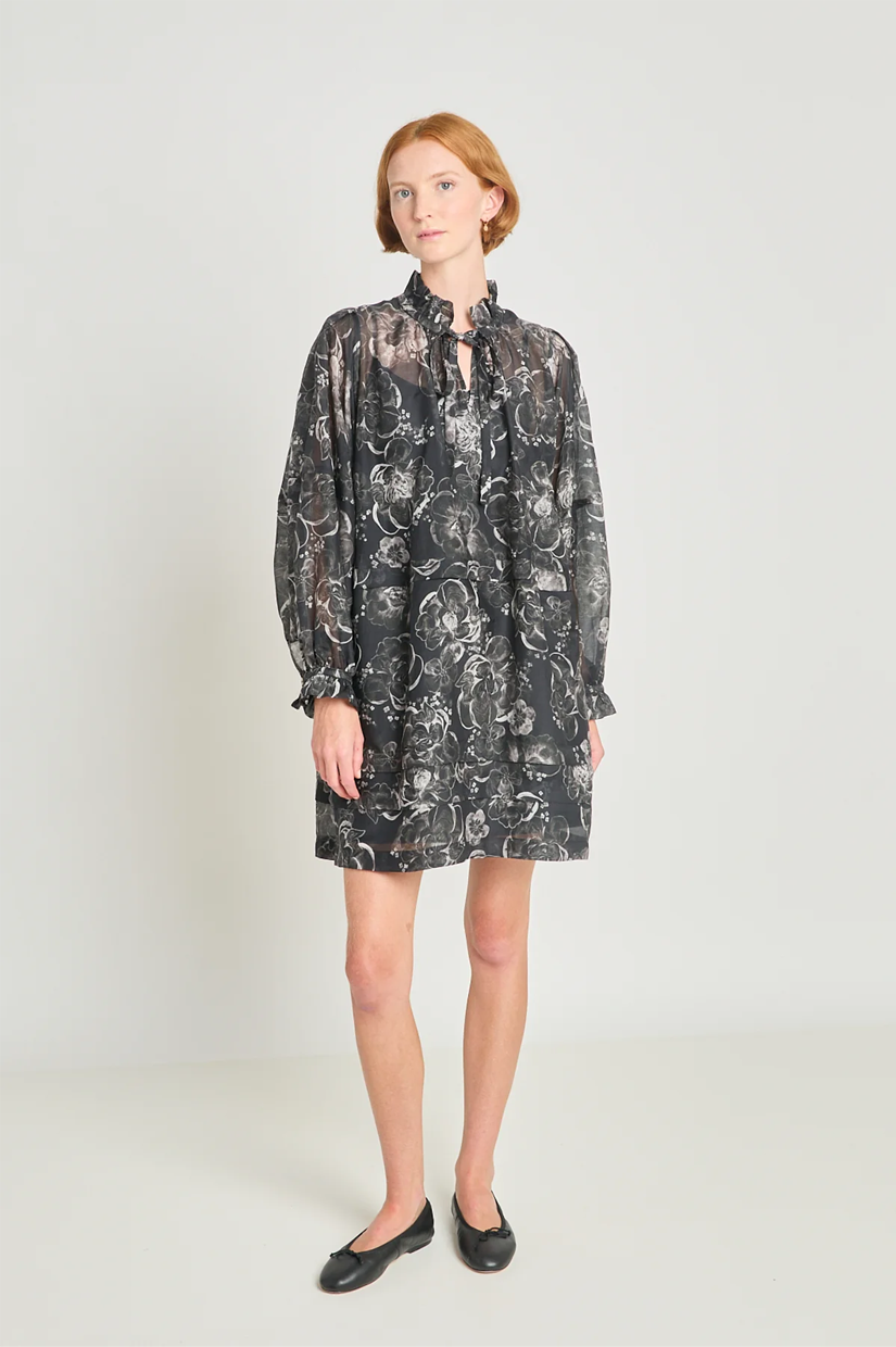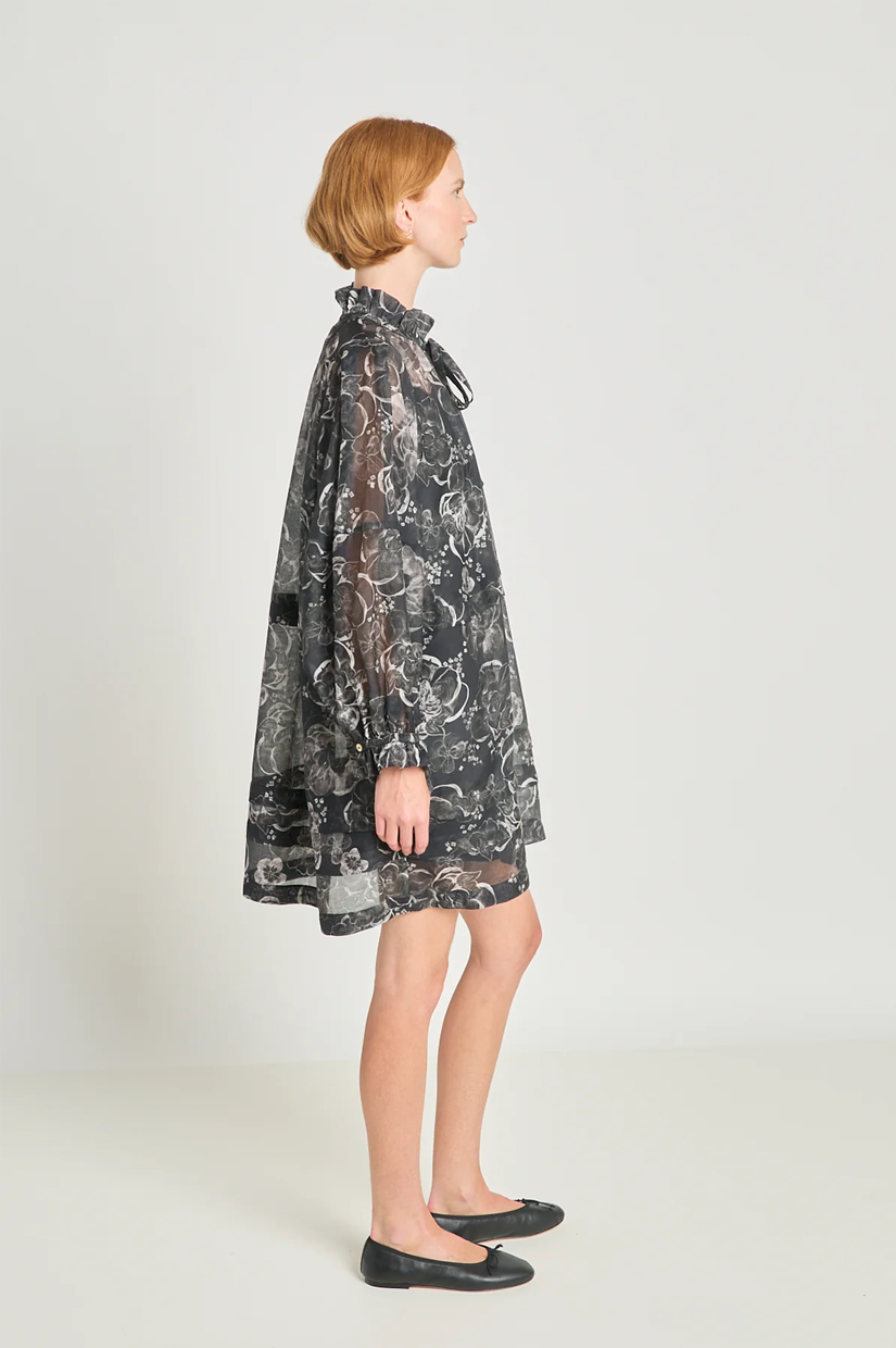 A voluminous silk-cotton dress, with long lantern sleeves, gathered skirt, and a gathered and ruffled neck with a sweet bow to tie at the front neck.