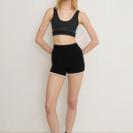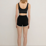 Superfine Merino wool seamless knit v-neck crop in our premium rib fabrication. Offers mid compression and lined with a self knit layer for support. This style features a contrast underbust design lines that shape the bust and a minimal jacquard logo at back hem band. Designed with highly breathable natural fibres for a super-soft second-skin feel against the body.