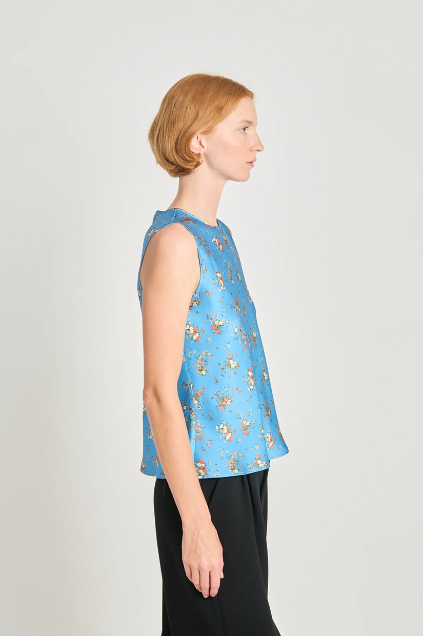 Deep breath. Sweet and simple, this bias-cut, sleeveless blouse features a round neck and back-neck button closure, and is cut in a sky blue silk satin that we sourced from deadstock.