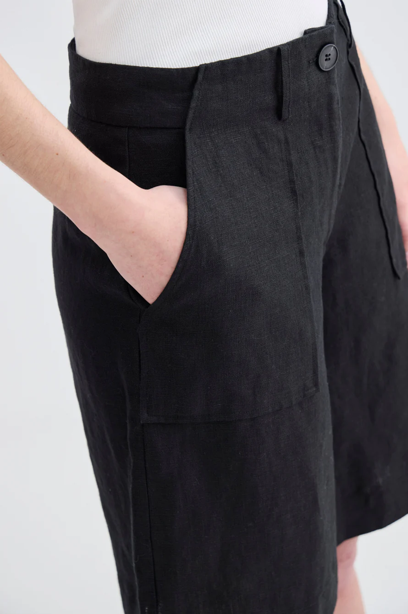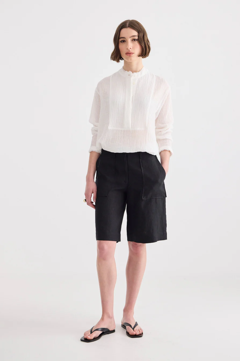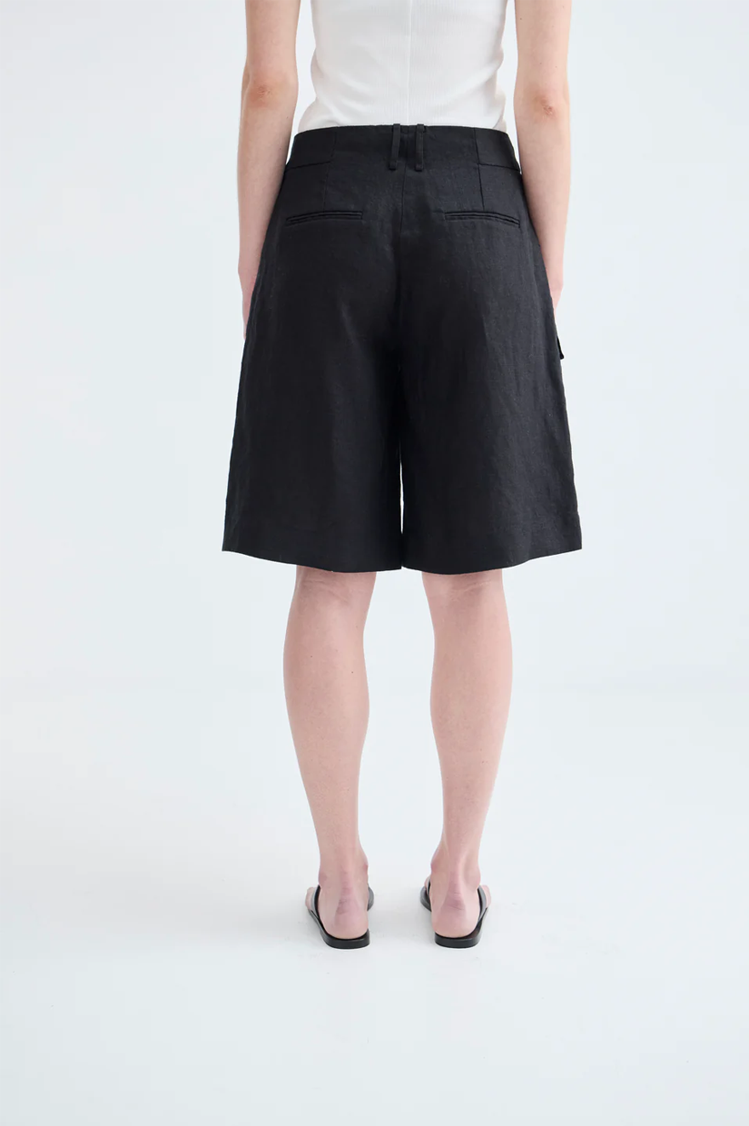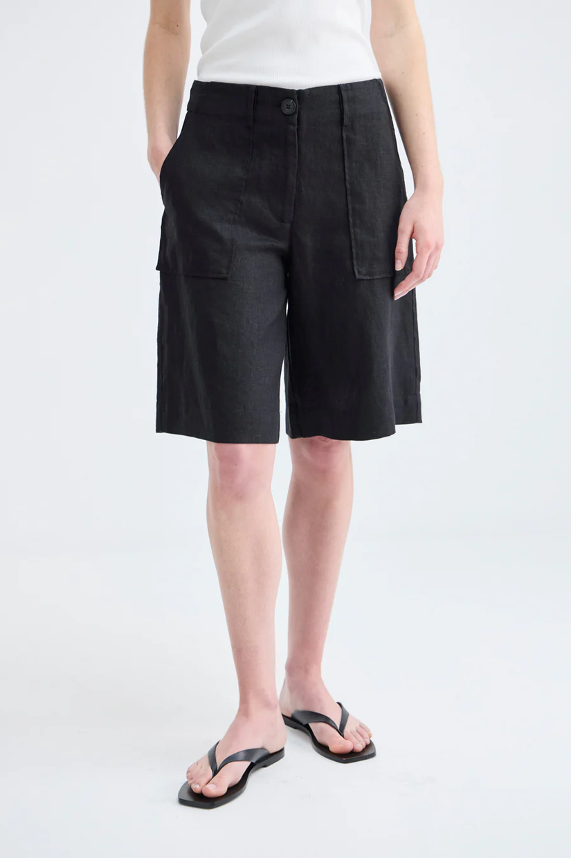 Meet the Granada Short. Tailored, minimalist, and made for long summer days that roll into warm nights. Cut from crisp 100% black linen, it features a clean silhouette with a slightly structured shape that works just as well barefoot at the beach as it does with a strappy sandal after dark.