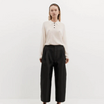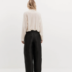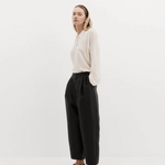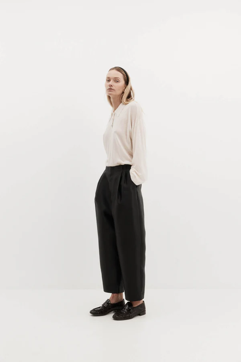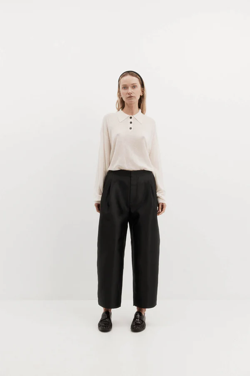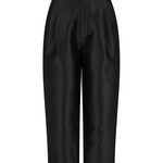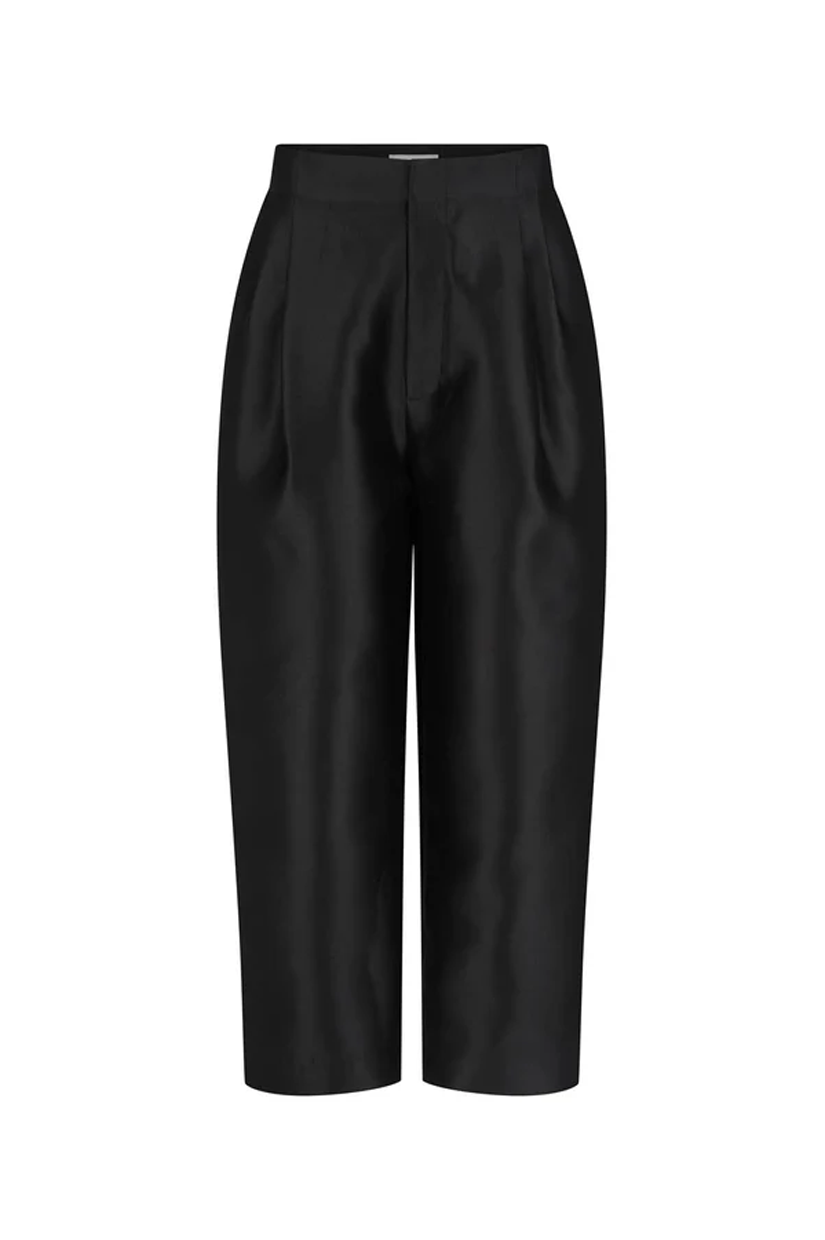 A cropped trouser in satin twill, defined by front pleats and a subtle ballooned silhouette that tapers at the ankle. Detailed with front and back pockets and finished with a centre-front zip with hook-and-bar fastening.