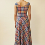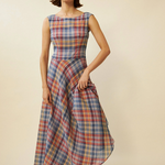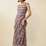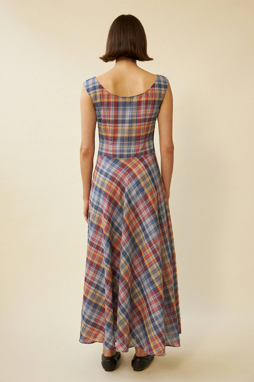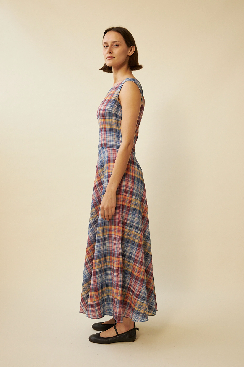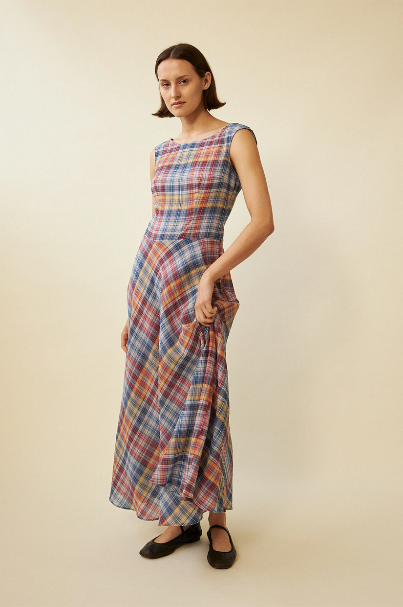 Long sleeveless dress with a soft boat neckline that scoops at the back. Fitted bodice with darts, finishing just below the waist, leading into a full bias-cut skirt. Fastens at the side with an invisible zip.