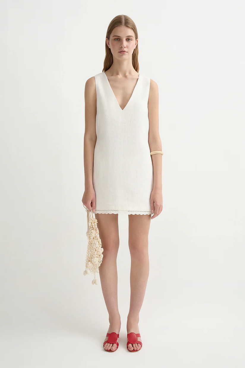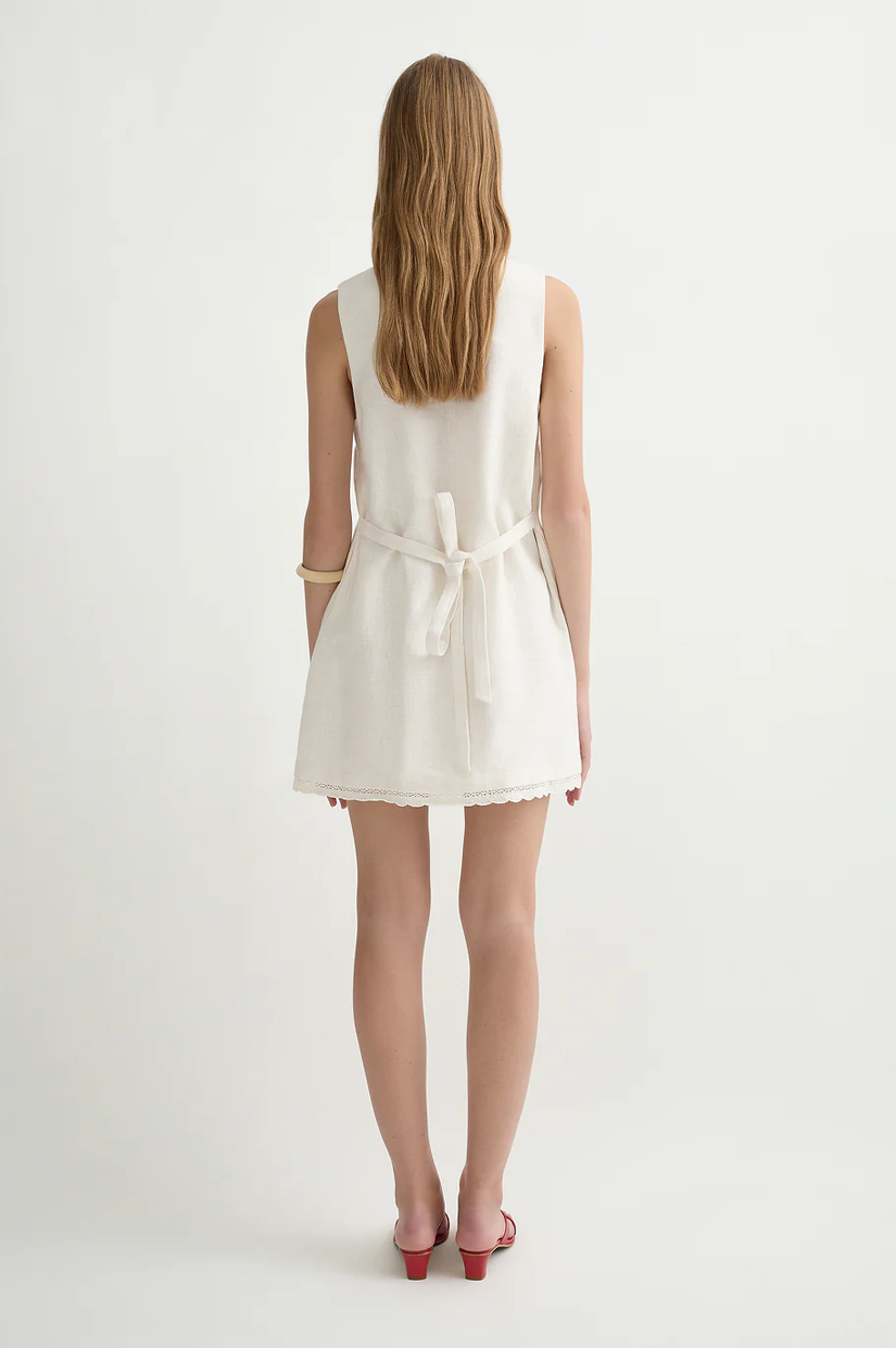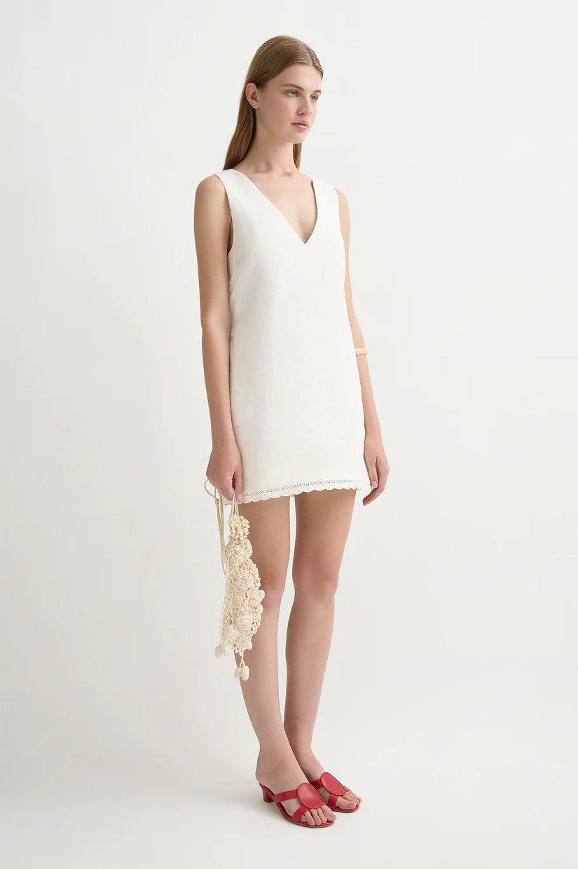 Cut from premium linen, the Effi Mini Dress features a relaxed A-line silhouette with an adjustable waist tie detail and a deep v-neckline that falls into a subtle crochet hem.