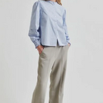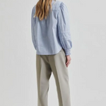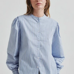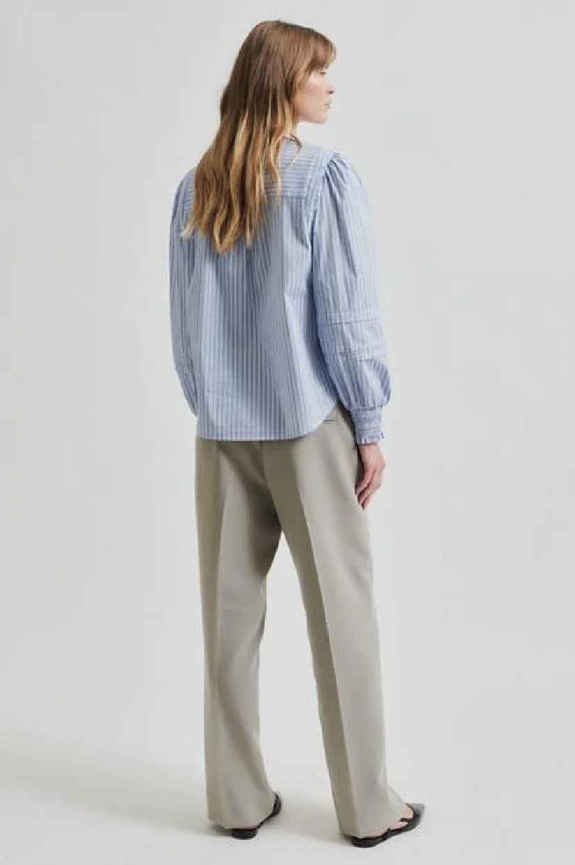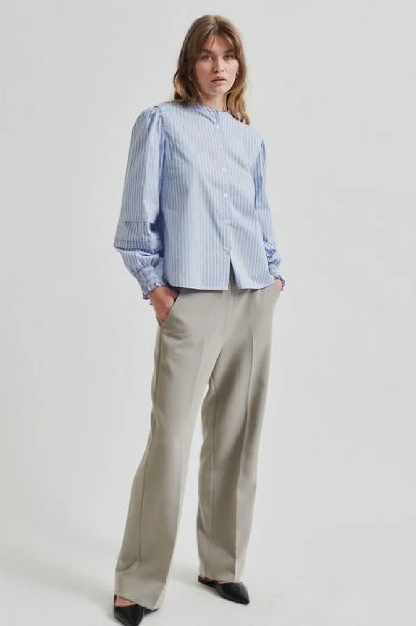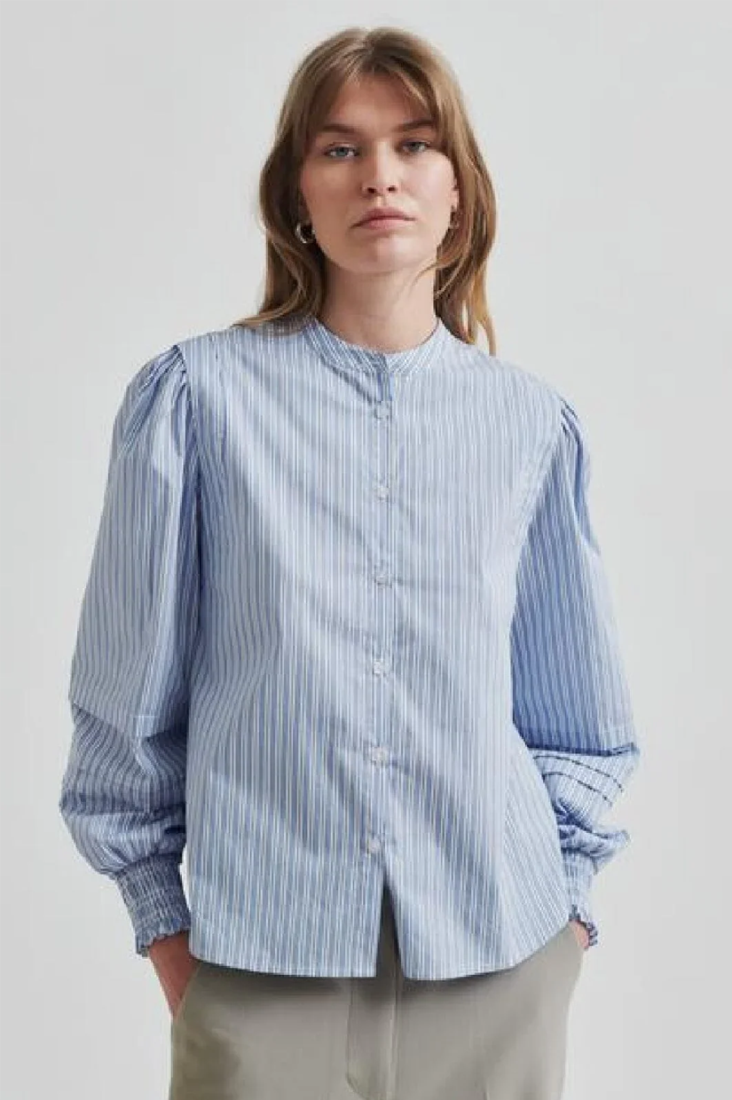 Second Female striped shirt with details on the sleeves. The striped shirt is made of a soft and comfortable cotton blend. With a small collar and button placket. Overlapping detail at the shoulder seam and puff sleeves with decorative pleats that give the cut structure. Long sleeves with elastic at the hem. Gatherings on the yoke at the back. Classic fit.