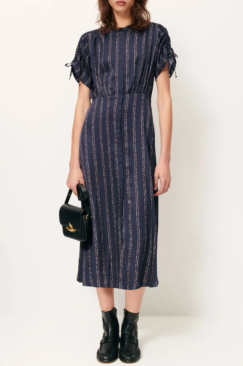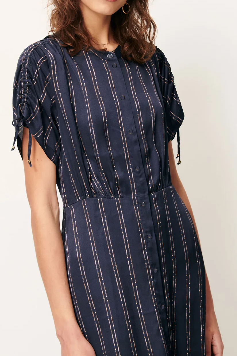 Long button-up dress with gathering details and a drawstring on the sleeves in fluid viscose satin, printed in Italy, exclusive Sessùn pattern.