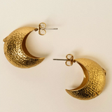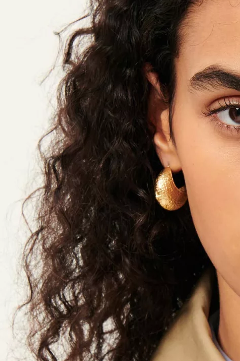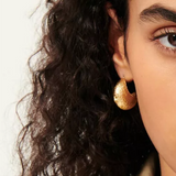 Large, domed gold hoop earrings with a textured effect and star relief design.