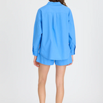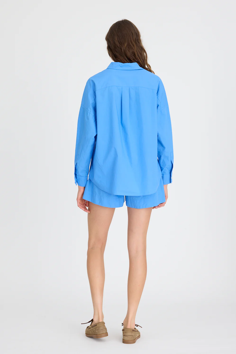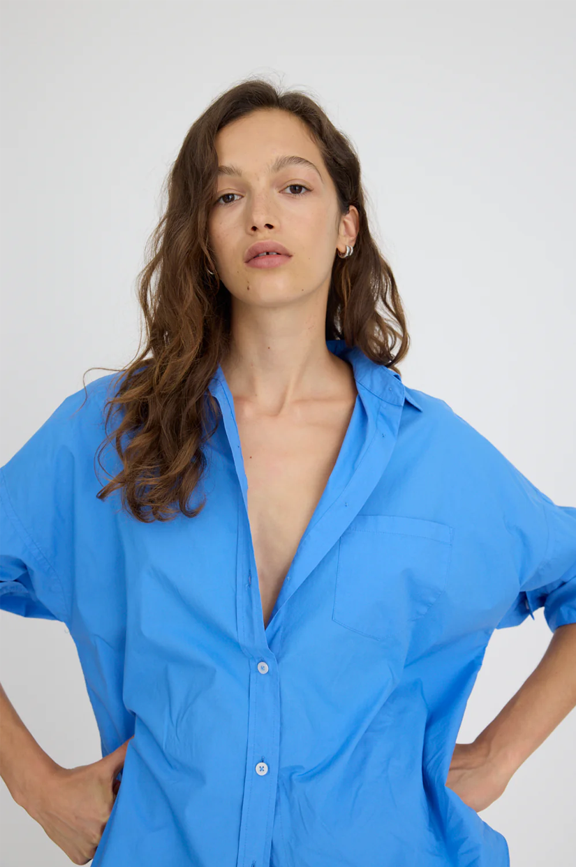 Our Signature Classic button-up shirt. Crafted from premium 100% cotton, this timeless piece features a chest pocket and a relaxed, slightly loose silhouette with drop shoulders. Its versatile design makes it ideal for layering underneath cozy knitwear or pairing with our matching Chiara shorts for a chic coordinated look.