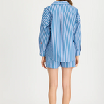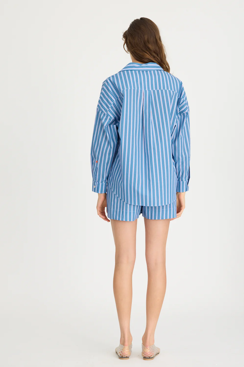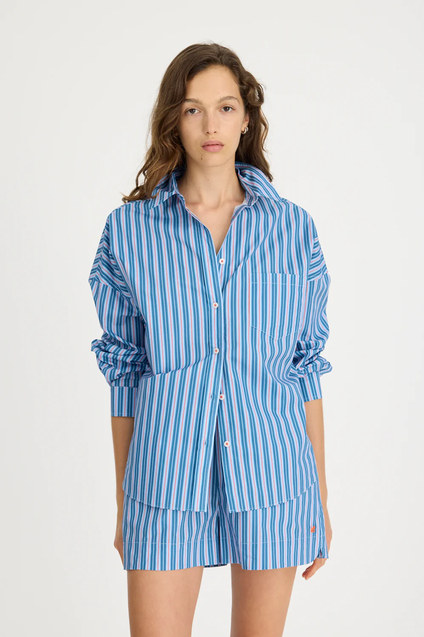 Introducing our Signature Classic Button-Up Shirt, featuring a stripe detail. Expertly crafted from 100% yarn-dyed cotton, this shirt effortlessly combines style and comfort. The design includes a practical chest pocket and our signature drop shoulders, creating a slightly loose silhouette perfect for layering under cozy knitwear or pairing with your favourite Chiara shorts.