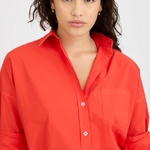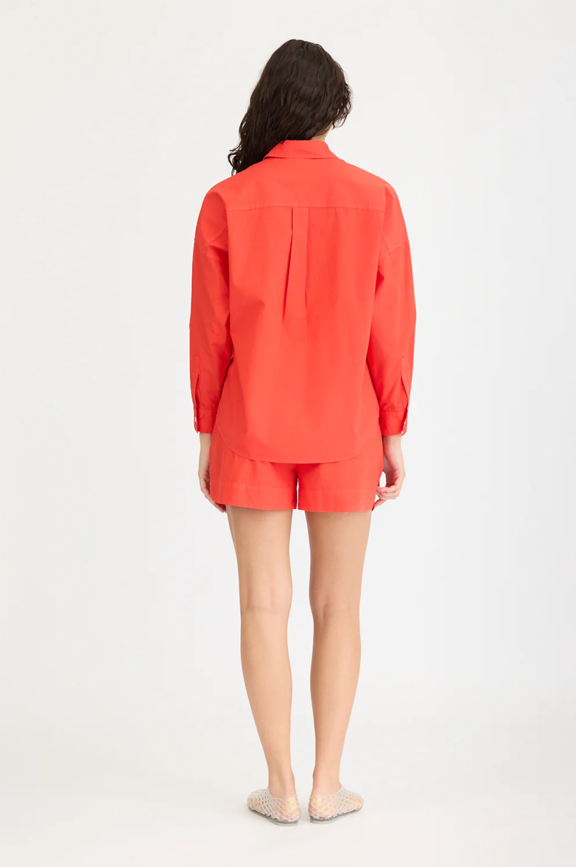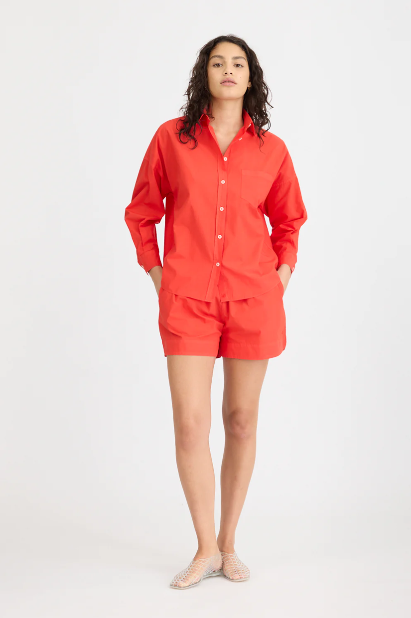 Our Signature Classic button-up shirt. Crafted from premium 100% cotton, this timeless piece features a chest pocket and a relaxed, slightly loose silhouette with drop shoulders. Its versatile design makes it ideal for layering underneath cozy knitwear or pairing with our matching Chiara shorts for a chic coordinated look.