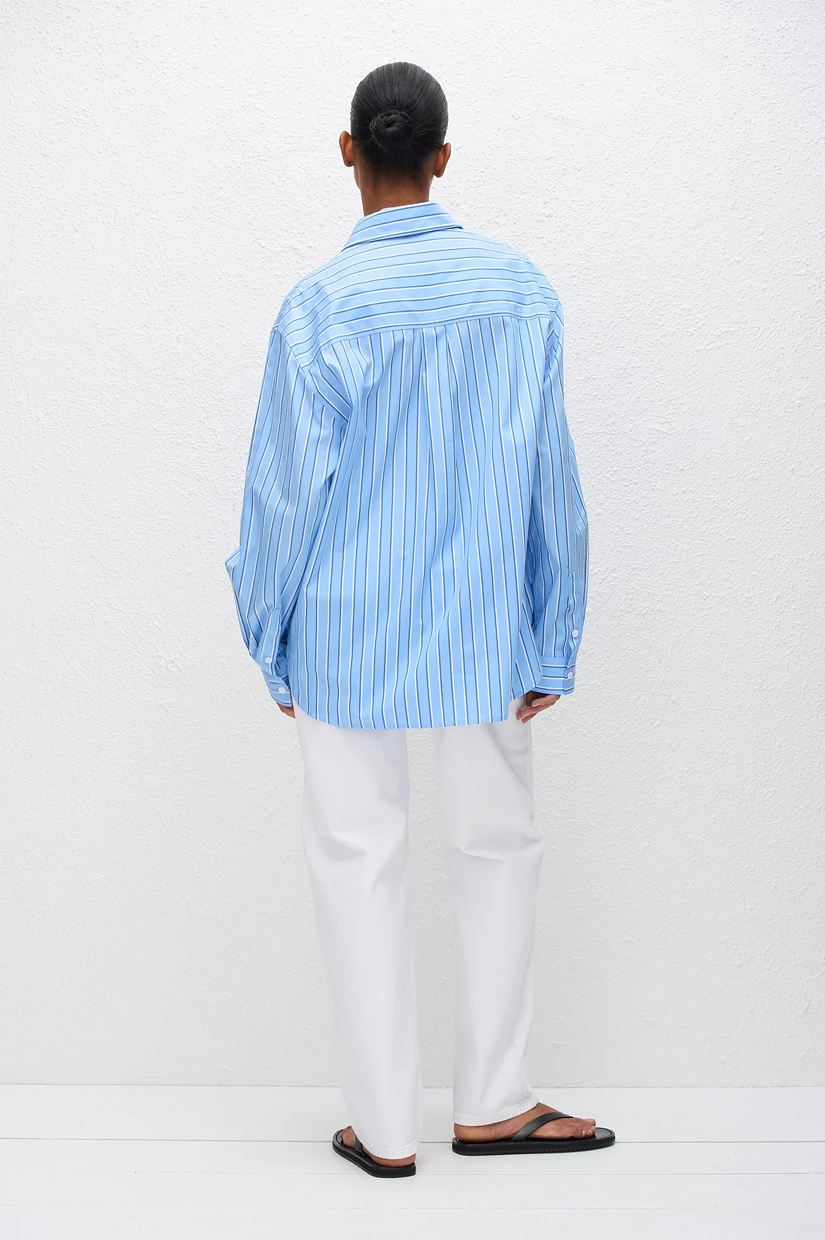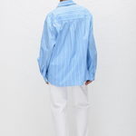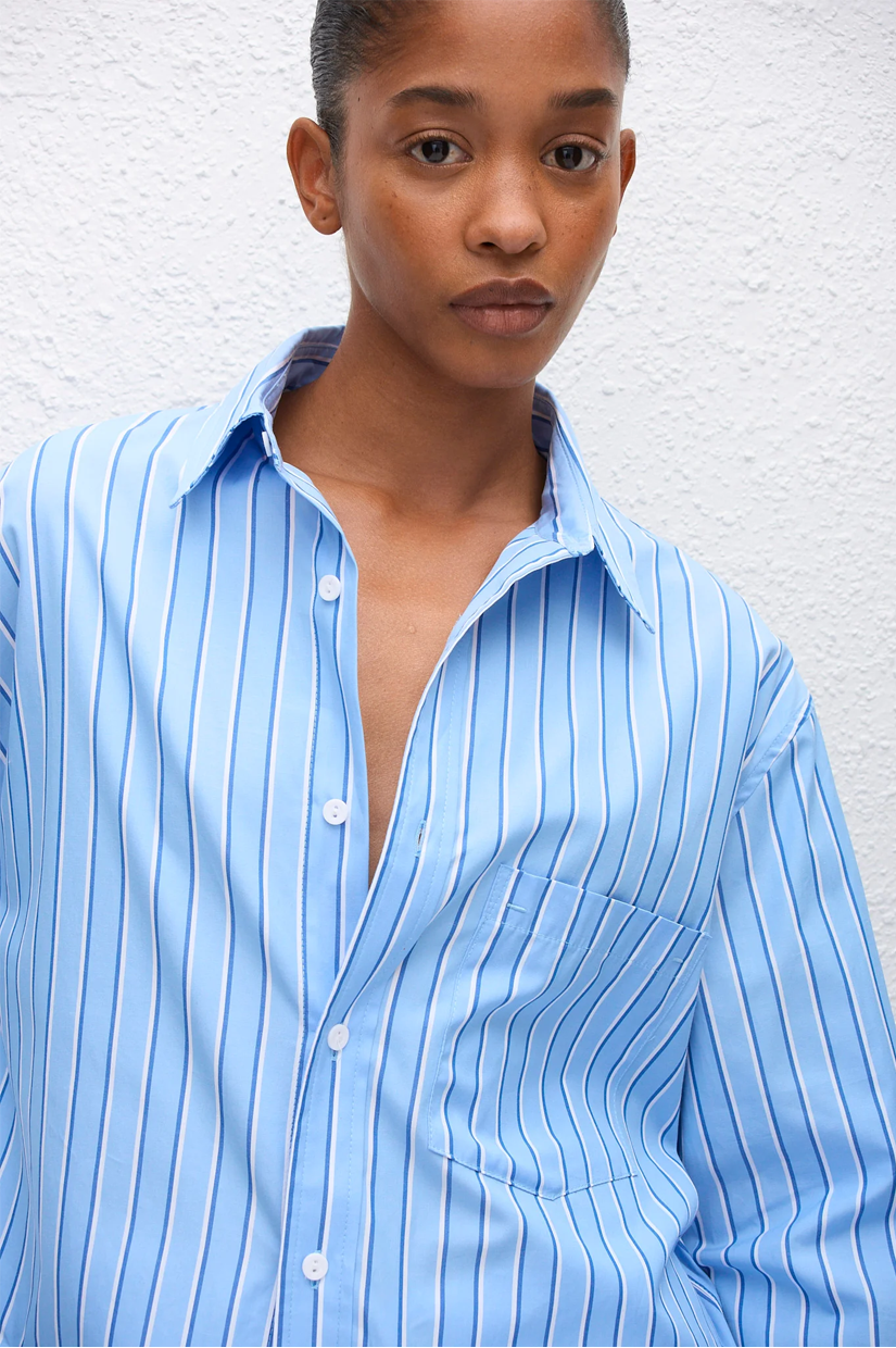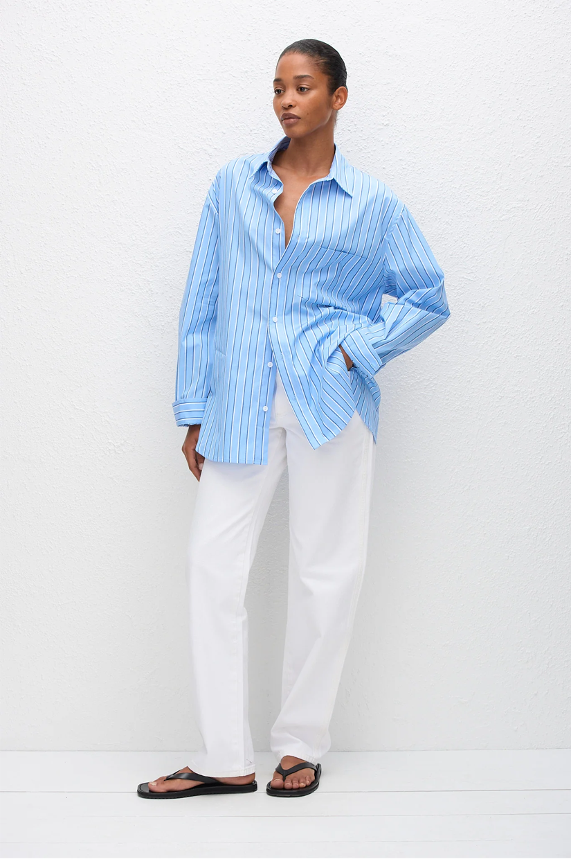 A classic, oversized menswear-inspired shirt with a single front pocket. Made in an organic cotton, this woven-stripe shirt offers a relaxed fit with curved hems at the front and back, and a single box pleat at back yoke. Wear tucked in to our Relaxed Jean, and pulled together with our Everyday Belt and a pair of sandals.