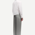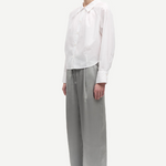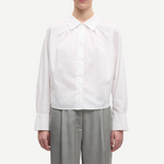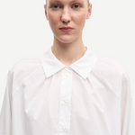 Long-sleeved shirt with a loose fit and curved sleeves. Button closure on the front and buttoned cuffs. Rounded hem. Draped detailing below the collar. Neck yoke seam. Main material made from 100% organic cotton.