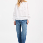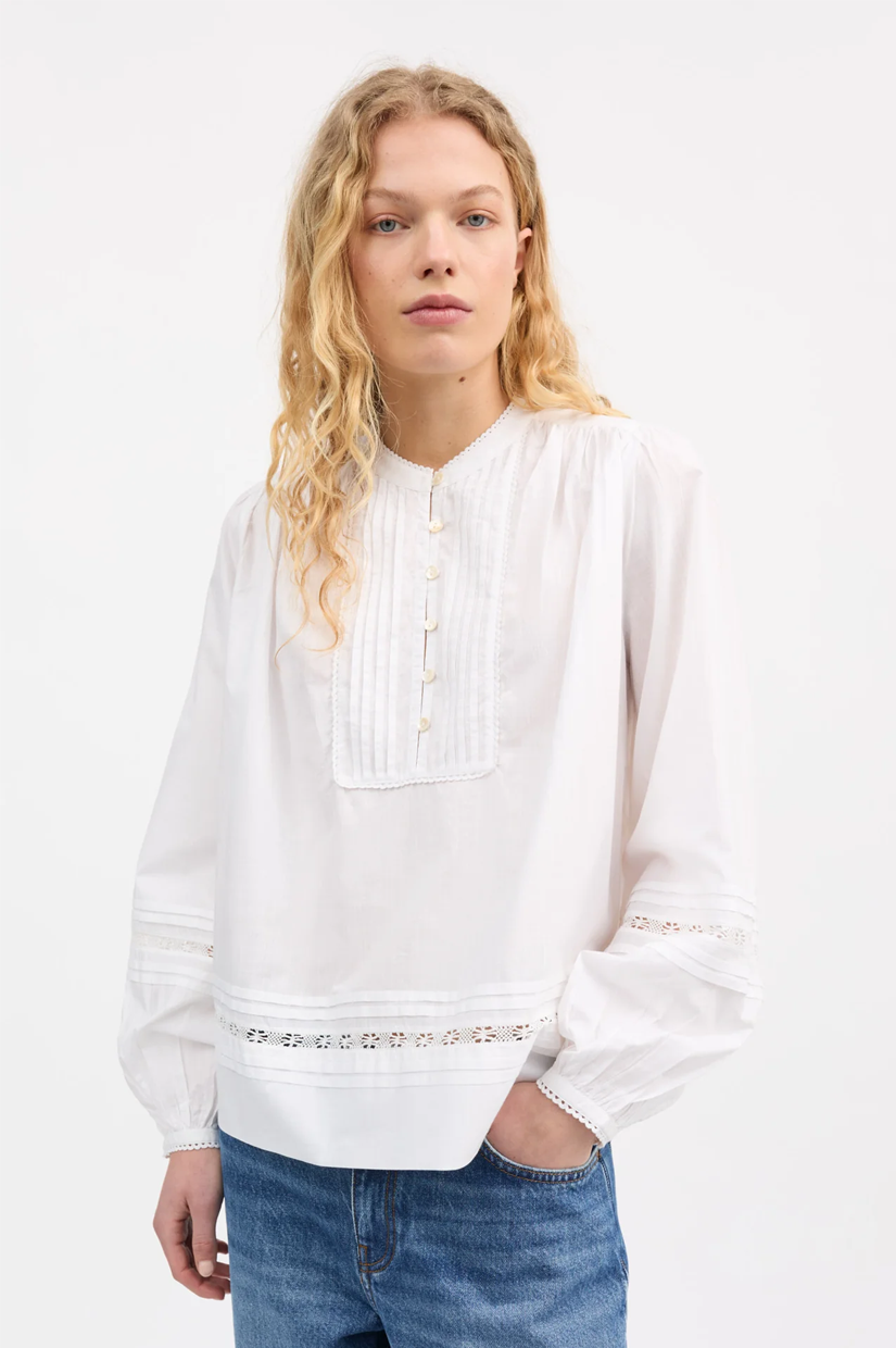 Leaf Shirt has a pin-tucked bib and lace inserts across the body and arms which add a feminine touch to this 100% organic cotton shirt. There are gathers at the shoulder and a lace trim runs around the collar and on the cuffs of the balloon sleeves. Six buttons with loops provide the fastening down the front.