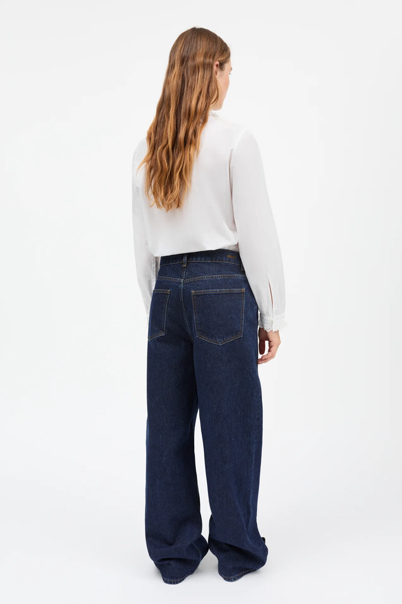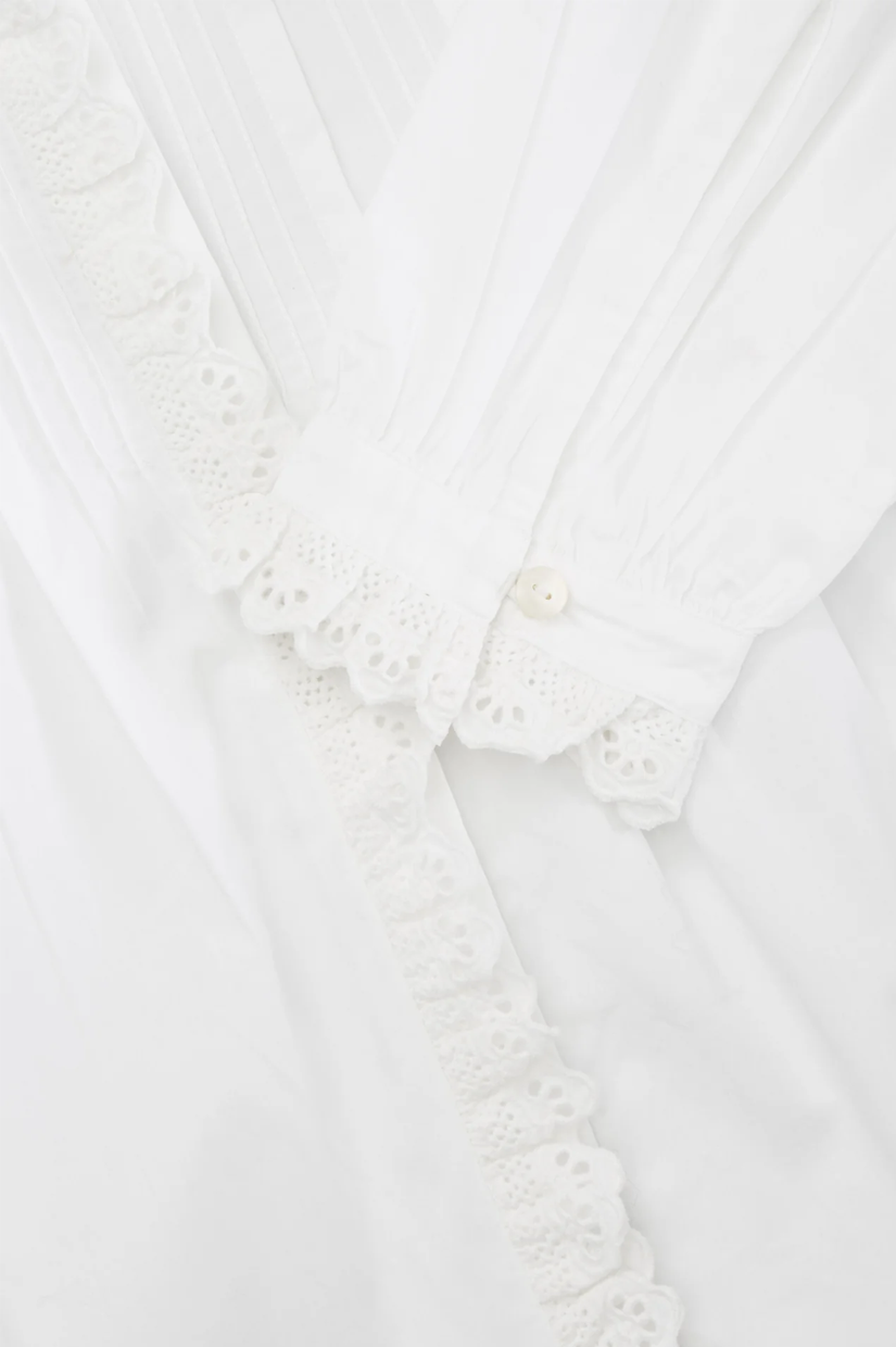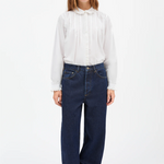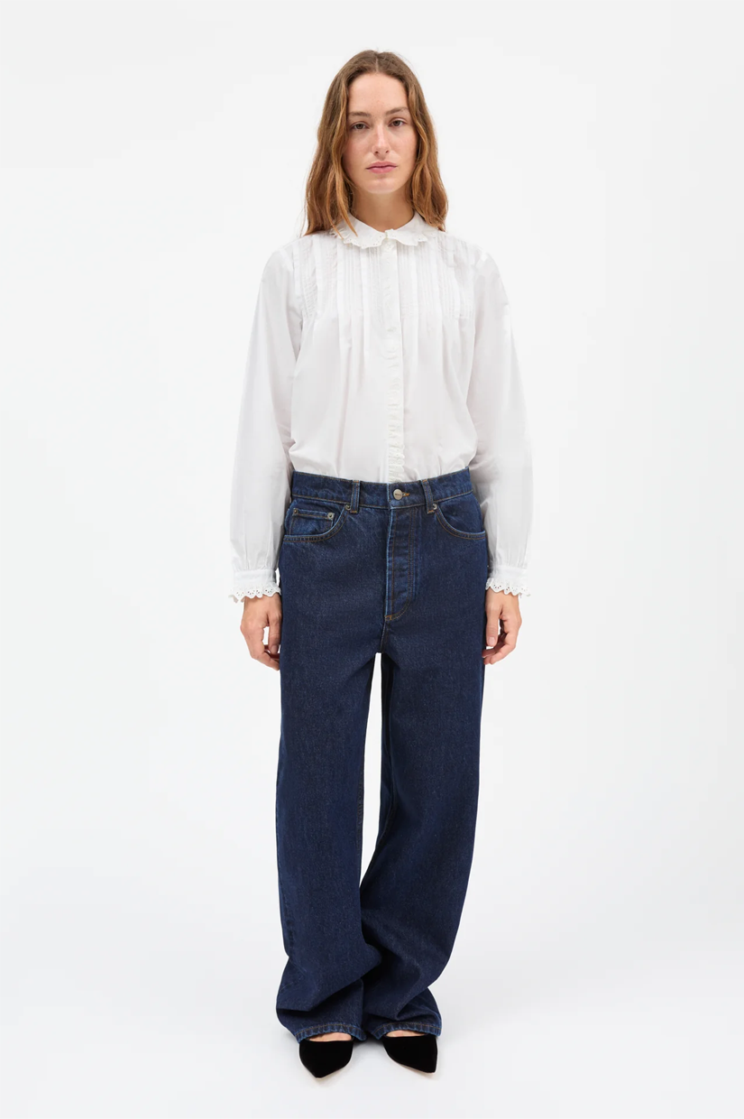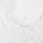 Lulu Shirt is a 100% organic cotton shirt with multiple fine pleats and pintucks running down the front. A hidden button placket is trimmed with delicate ruffled lace as is the collar. The voluminous sleeves are set with a shoulder seam slightly moved to the front and are finished with gathered cuffs, also edged with lace.