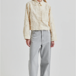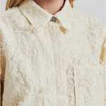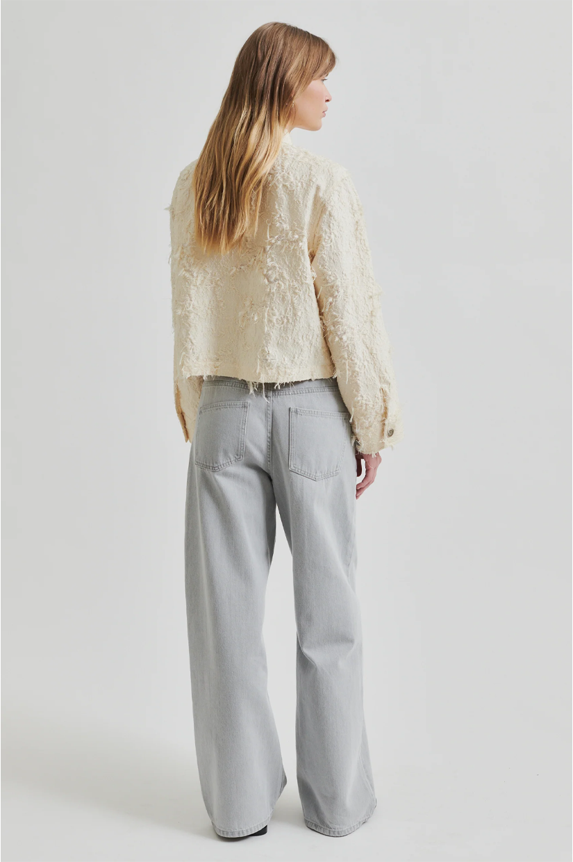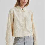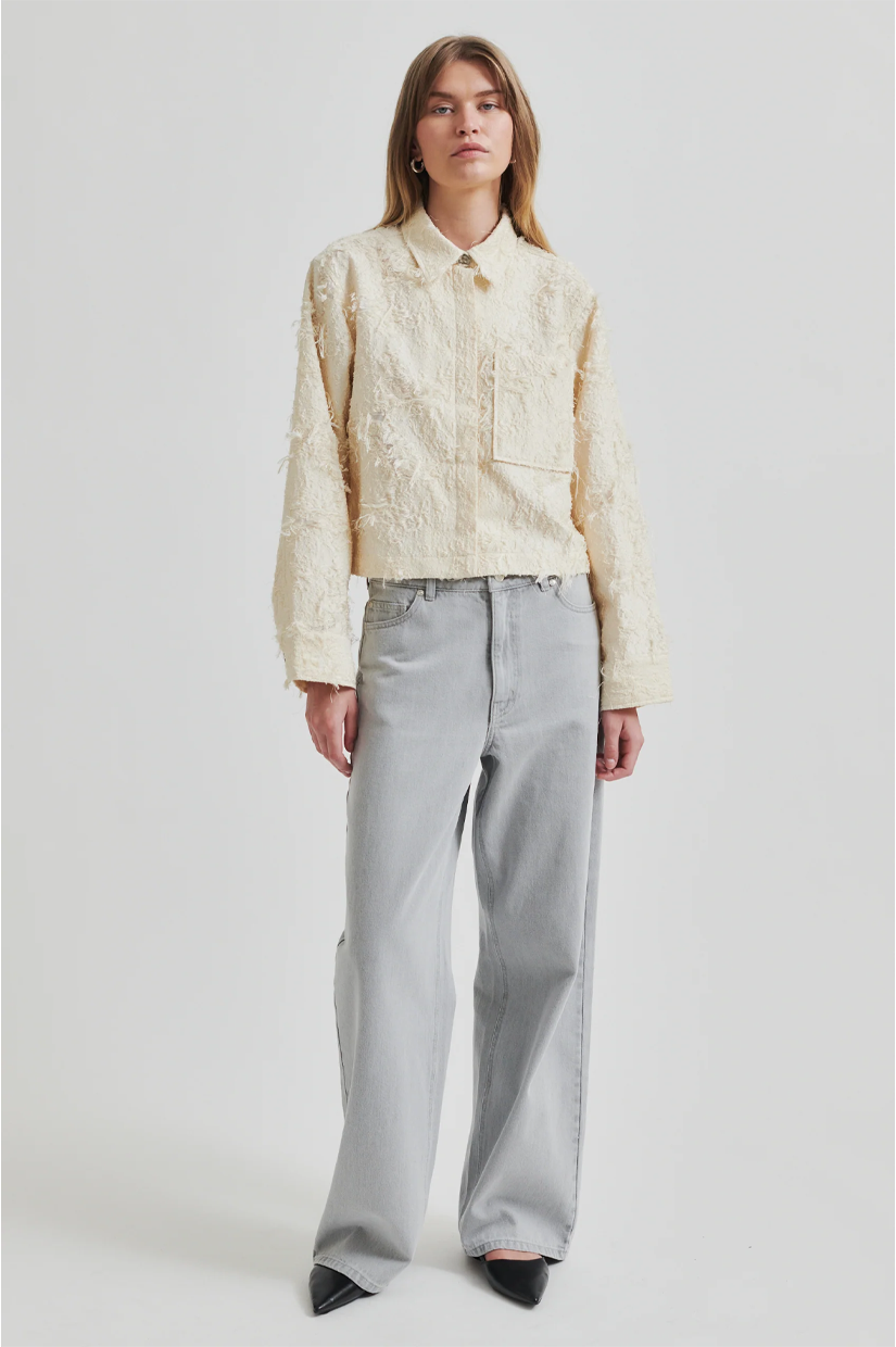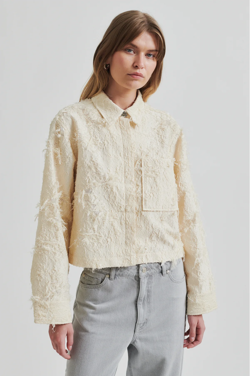 Second Female structured shirt. The shirt is made in a cotton-blend with all-over frayed threads that create a 3D structured effect. Featuring a regular collar and placket with concealed button-through fastening with silver decorative button visible at the top. Long sleeves with adjustable cuffs with silver, decorative buttons. Single chest pocket. Straight bottom hem. Loose boxy fit.