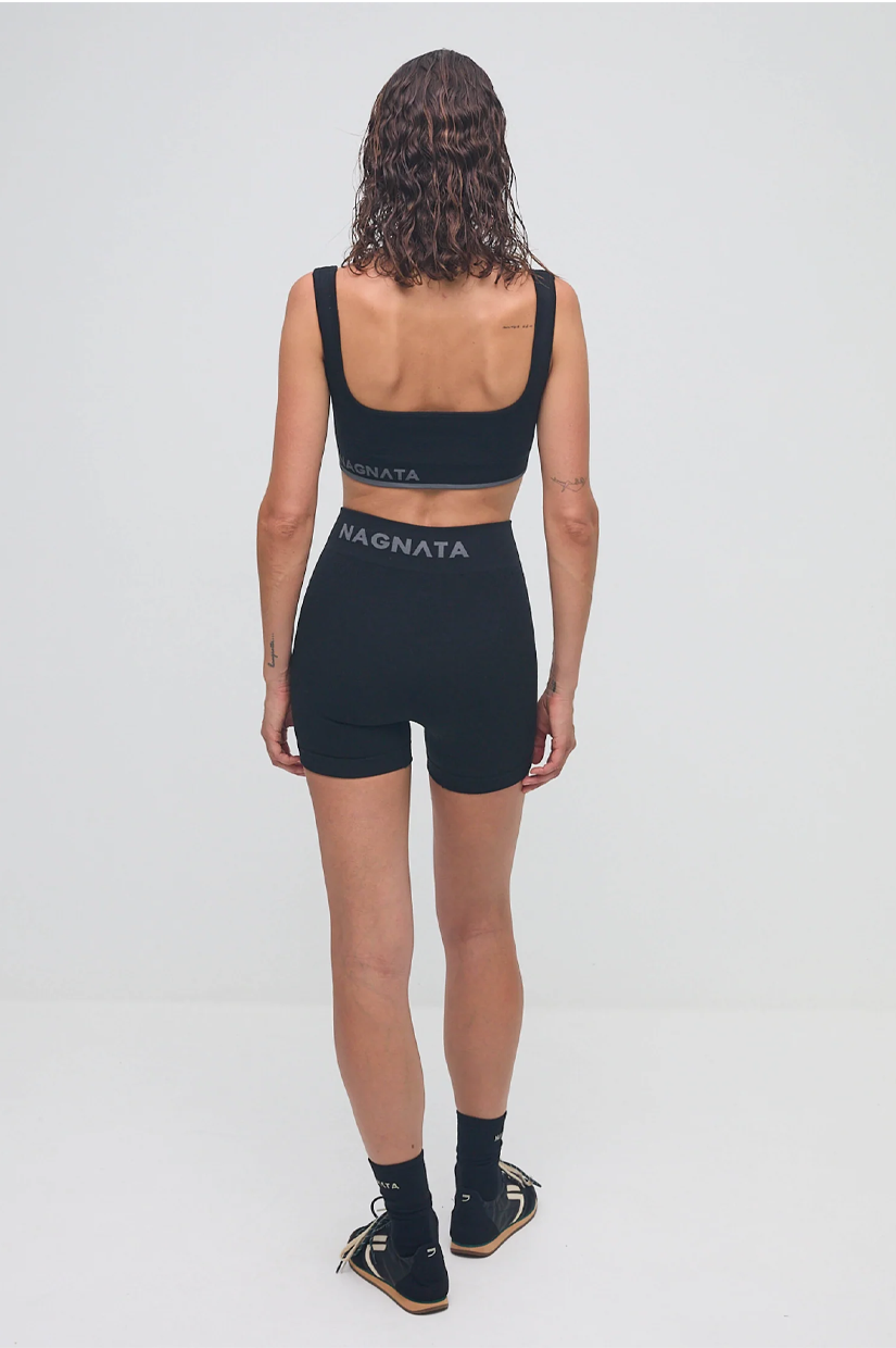Superfine high-waisted Merino wool seamless knit rib mini short made in our signature seamless fabrication offering mild compression for support and breathability.The style features a double layer waistband with jacquard Nagnata logo on front and back waistband. Crafted in our signature Nagnata rib, these shorts include contrast jacquard stripe placement artwork.