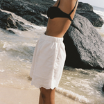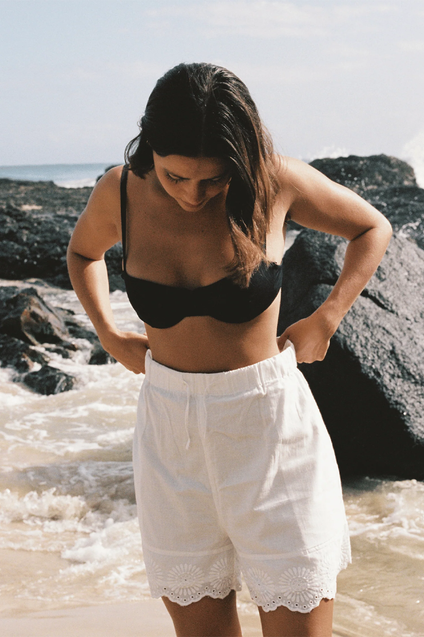 Crisp cotton poplin with a scalloped broderie hem and mid-thigh length. A relaxed drawstring waist makes these the perfect throw-on for long mornings or warm evenings.