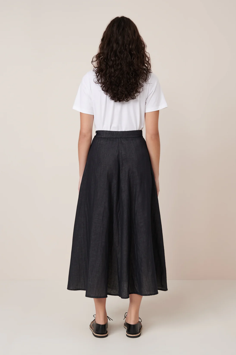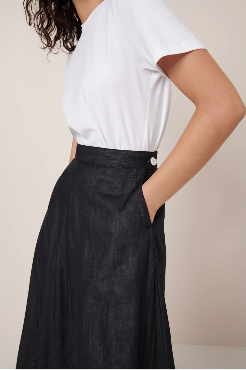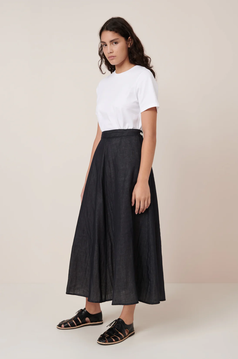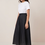 The Rotation skirt offers a classic a-line silhouette, crafted from soft organic cotton double cloth for a refined yet comfortable feel. Designed with a fitted waistband with a nut button closer and practical side seam pockets. With a standard fit that falls to ankle length, this versatile peice pairs effortlessly with any wardrobe staple.
