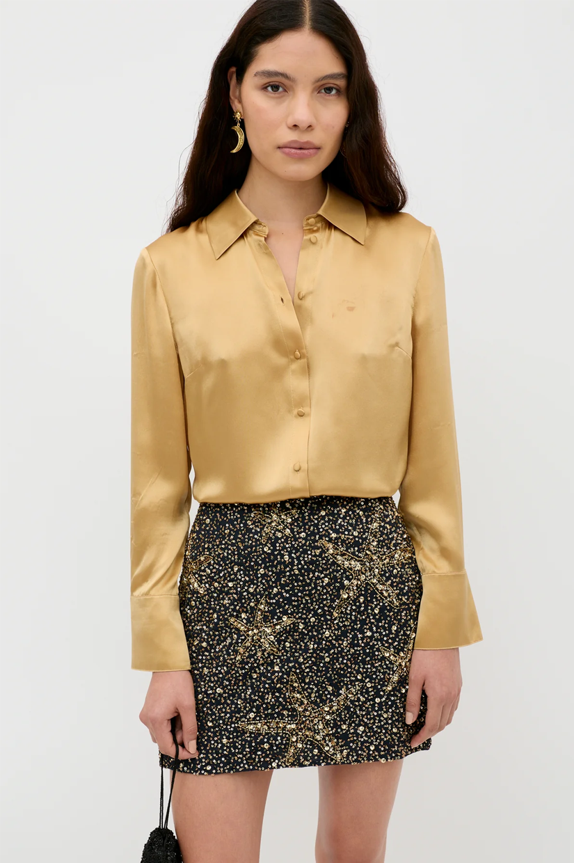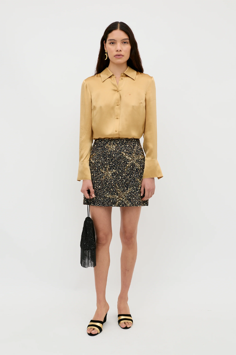 Our Minna Skirt captures a true swinging sixties energy. Adorned with sequins and embellished with a starfish print, it’s striking but the navy base-colourway makes it easy to style. Pair with a tailored shirt or a top with romantic ruffles for a playful contrasting look.