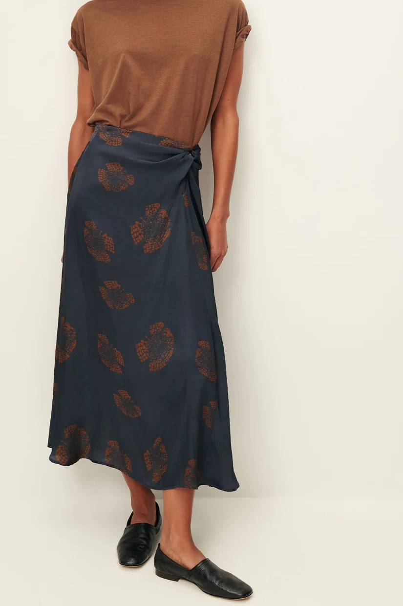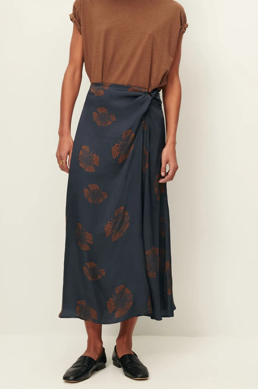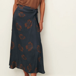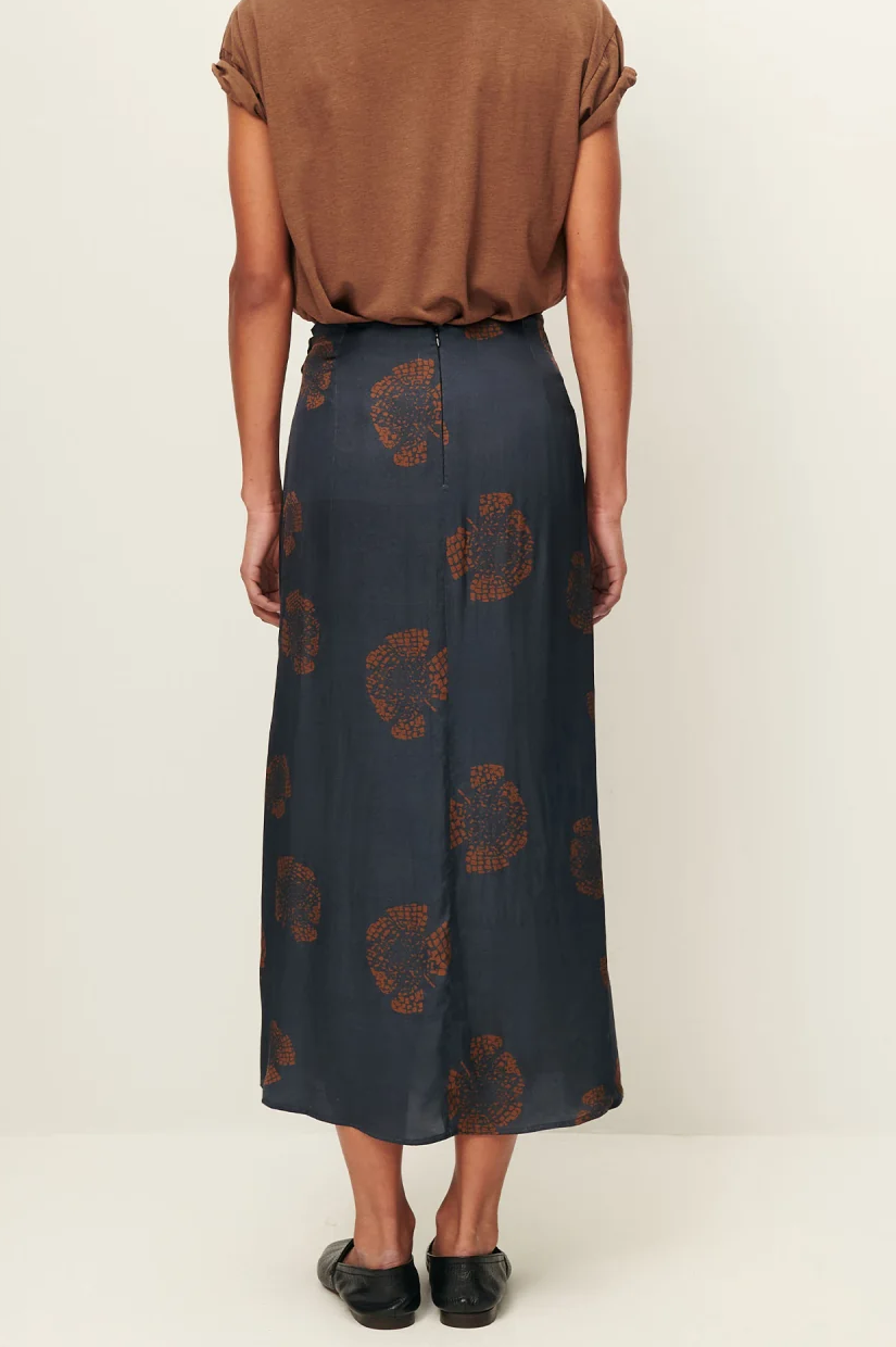 Mid-length flared skirt with a scrunch detail at the waist in fluid viscose satin printed in Italy, exclusive Sessùn pattern.