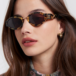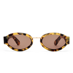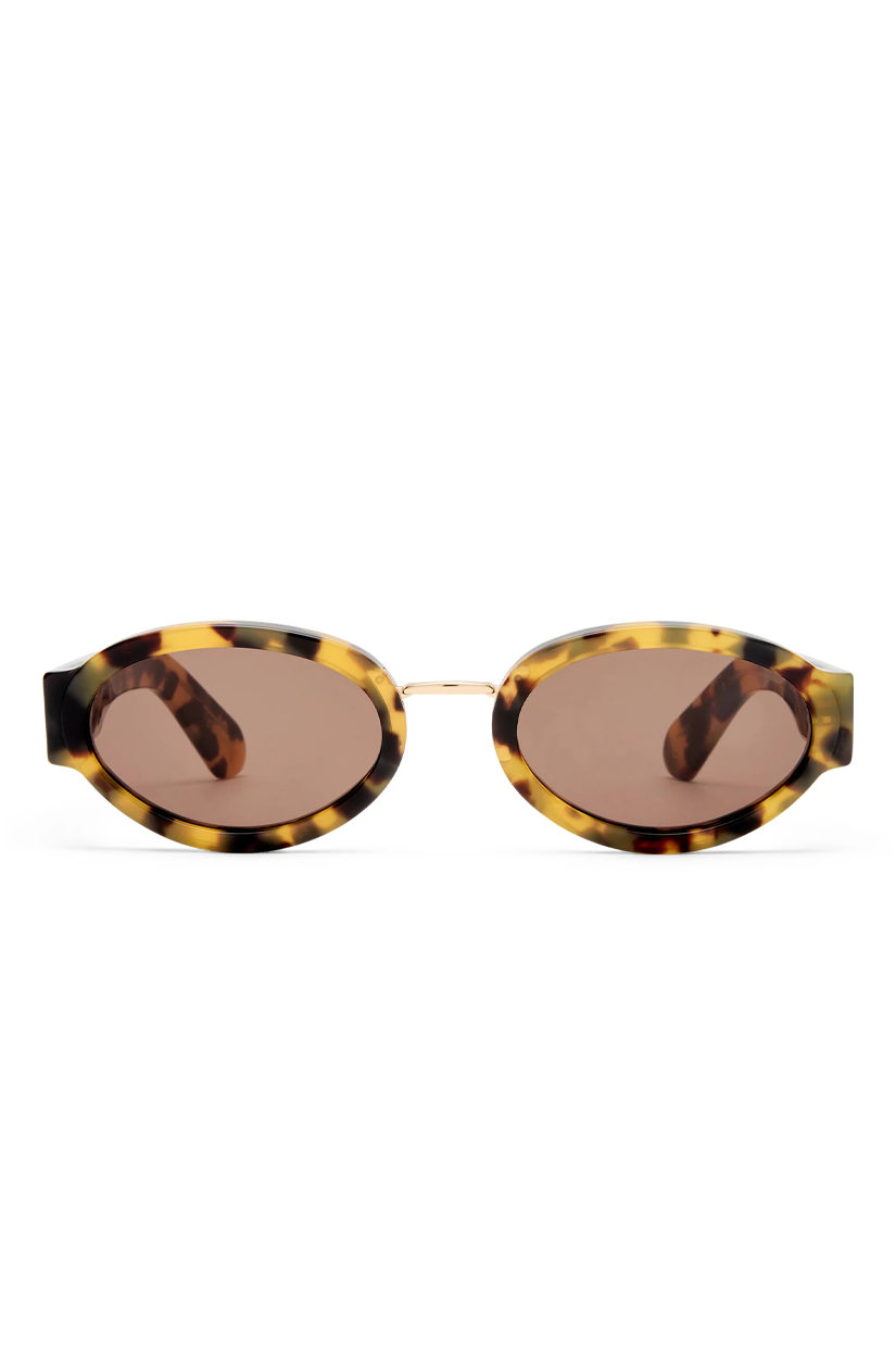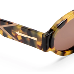 The All Out sunglasses, handcrafted in Crazy Tort bio-acetate pairs a warm tortoiseshell pattern with brown mono lenses for a classic yet distinctive look. A light tan KW arrowhead sits at the temple, while the gold metal nose bridge adds contrast and definition to the soft oval shape.